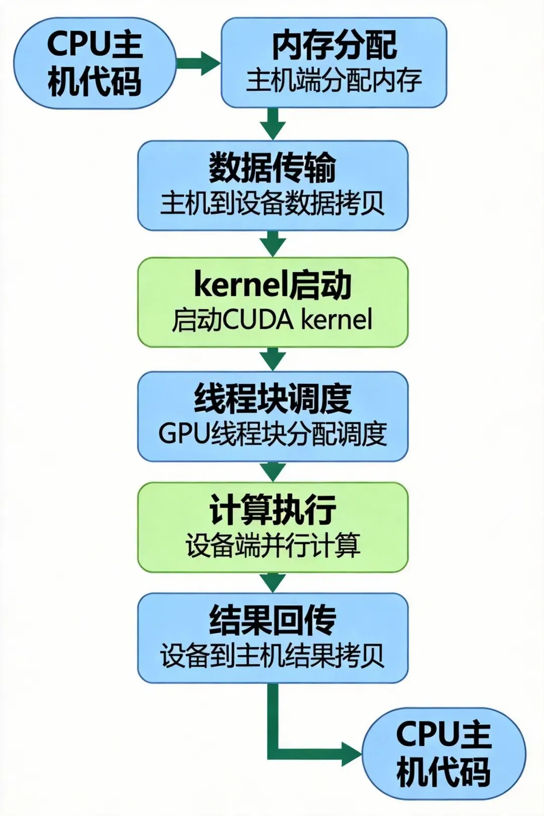 图2: CUDA kernel从CPU到GPU的完整执行流程__global__ voidmatrixMulKernel(float* A, float* B, float* C, int width) { // 使用共享内存优化矩阵乘法 __shared__ float ds_A[TILE_SIZE][TILE_SIZE]; __shared__ float ds_B[TILE_SIZE][TILE_SIZE]; int bx = blockIdx.x; int by = blockIdx.y; int tx = threadIdx.x; int ty = threadIdx.y; // 计算全局索引 int row = by * TILE_SIZE + ty; int col = bx * TILE_SIZE + tx; float sum = 0.0f; // 分块计算 for (int i = 0; i < (width + TILE_SIZE - 1) / TILE_SIZE; ++i) { // 加载数据到共享内存 if (row < width && i * TILE_SIZE + tx < width) ds_A[ty][tx] = A[row * width + i * TILE_SIZE + tx]; else ds_A[ty][tx] = 0.0f; if (i * TILE_SIZE + ty < width && col < width) ds_B[ty][tx] = B[(i * TILE_SIZE + ty) * width + col]; else ds_B[ty][tx] = 0.0f; __syncthreads(); // 同步确保数据加载完成 // 计算部分乘积 for (int k = 0; k < TILE_SIZE; ++k) sum += ds_A[ty][k] * ds_B[k][tx]; __syncthreads(); // 同步确保计算完成 } // 写入结果 if (row < width && col < width) C[row * width + col] = sum;}