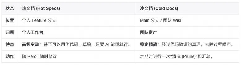 - 开发期(热数据):Spec 文档就在你的本地或 Feature 分支里。它是你的私人草稿本,随改随用,不需要实时同步给所有人,也不会影响主干。