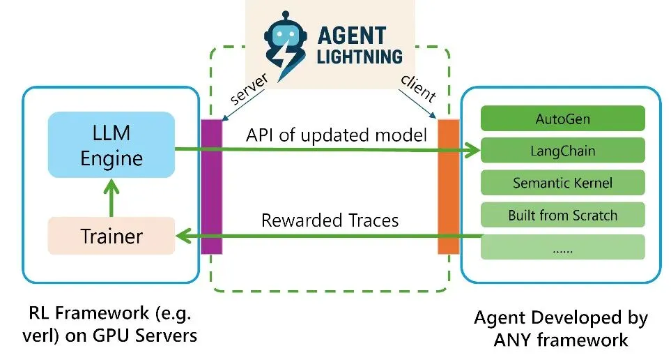 - 训练和执行完全解耦:Agent 还是用你熟悉的 LangChain、AutoGen 等框架写,照常跑业务。训练部分交给 Lightning Server,通过标准接口拉取任务、回传数据,完全不影响 Agent 的运行逻辑。