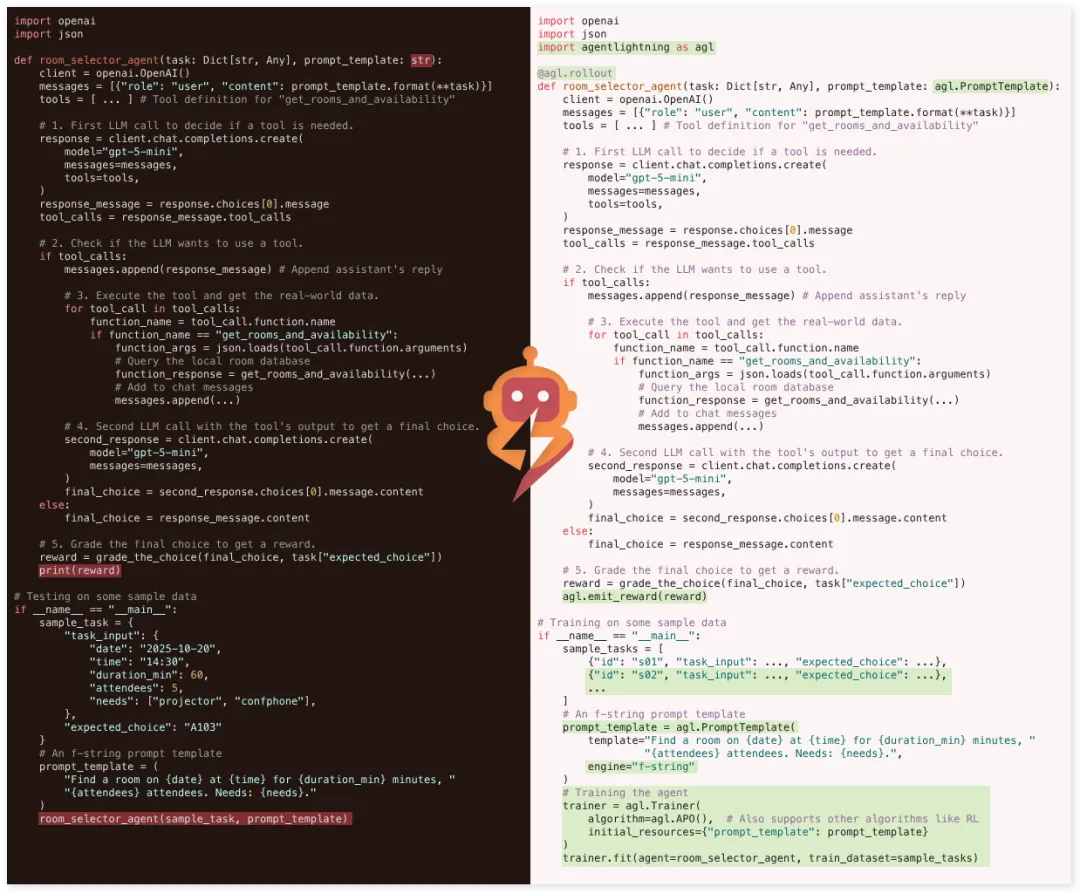 左侧为使用 LangGraph 实现的 Agent 的代码,右侧绿色部分是 Agent Lightning 需要加的代码,黄色部分(Agent 主体代码)为保持不变的代码。