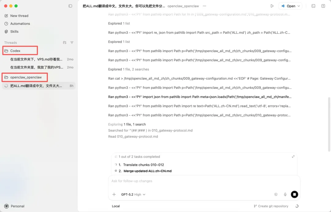 布局合理,视觉清晰。如果说以前的工具是 DOS 时代,那么 Codex App 就像是带你跨入了 Windows 时代。它非常适合非职业程序员,可视化界面支持多任务并行,极其直观。