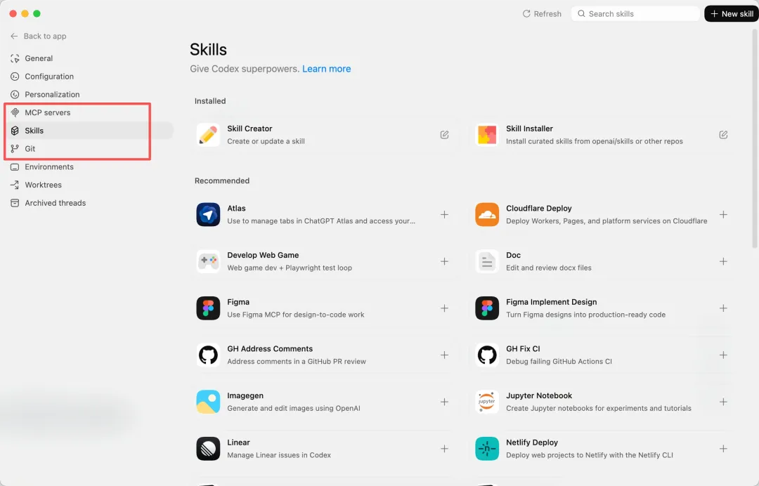 很多人知道 Skill 好,但是配置比较麻烦。现在好了,CodeX 界面就能看到 MCP 和 Skills(功能插件)。