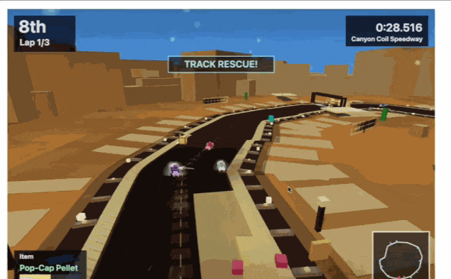 使用 Three.js 实现 Voxel Velocity 作为一个 3D 体素卡丁车赛车游戏,只有一种模式:单人比赛(总是 3 圈,1 个人类对 7 个 CPU,所有 8 条赛道立即在这个模式下可用,没有进度限制)。构建一个最小的赛前流程,仅包括:赛道(8),角色(8),难度(轻松/标准/刻薄),可选的镜像模式,可选的允许克隆,和开始比赛,加上一个选项菜单和一个赛中暂停菜单(恢复/重新开始/退出)。创建一个街机驾驶模型,具有灵敏的操控,宽容的擦墙碰撞,有意义的漂移作为主要技能,以及一个漂移充电系统,产生精确的加速等级(1 级 0.7 秒,2 级 1.1 秒,3 级 1.5 秒),同时保持基准速度「快但可读」,并且在宽阔的道路上保持持续的超车。实现正好 8 个道具,单道具容量,微妙的位置加权分布,和温和的效果(最大失控 ≤1.2 秒,最大转向禁用 ≤0.6 秒),创造滑稽的混乱而没有硬眩晕,加上在加速期间减少 50%的越野减速。定义 8 个角色及其给定的统计数据和 AI 倾向,实现 CPU 难度预设和赛道编写的赛车/变化样条线,漂移区和危险回避,以便 AI 使用多车道宽度进行干净的超车,并发布 HUD/音频要素(位置,圈数/最后一圈横幅,小地图,道具槽,计时器/分段,可读的音效,和每个赛道一个音乐循环)。