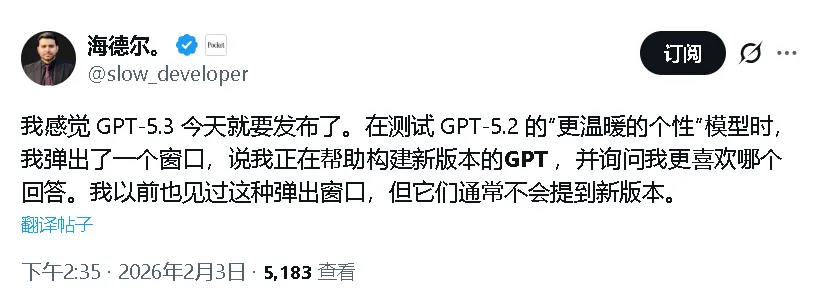 最后忍不住再剧透一下,有大佬预测 GPT5.3即将到来!