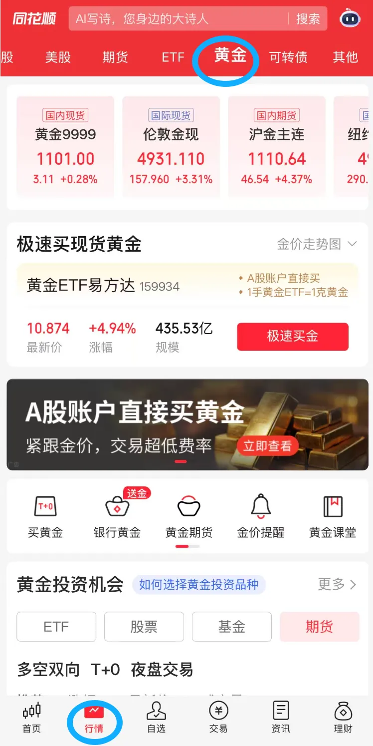 模块的路径也非常简单,进入同花顺APP,依次进入行情-黄金,即可进入黄金模块,下面说一些西门常看的代码。