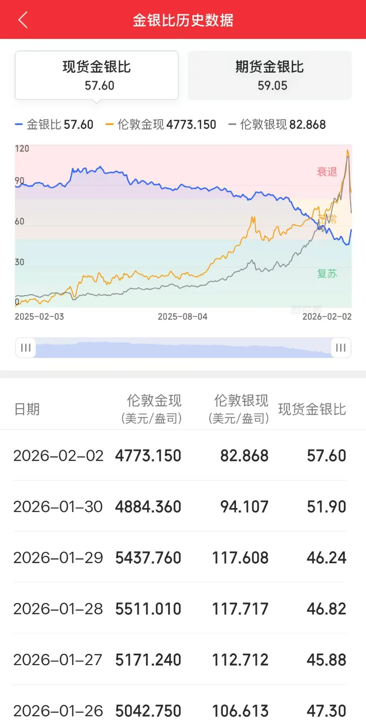 现货金银比是伦敦金现和伦敦银现单位均为美元/盎司,金银比=金价/银价,表示1单位黄金可兑换的白银数量。