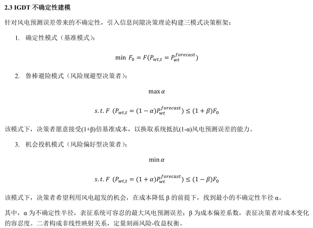 1.不确定性-风险偏好自适应决策框架:将IGDT理论与多能系统优化深度结合,构建三模式决策框架,使调度策略能够根据决策者风险偏好自适应调整,突破了传统单一确定性优化的局限。
