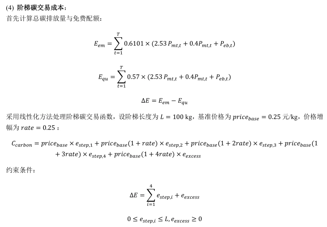 2.精细化阶梯碳交易建模:构建基于实际排放与基准配额差额的阶梯碳交易成本模型,精确反映碳市场的非线性定价机制,较传统线性碳交易模型更符合实际市场运行特性。