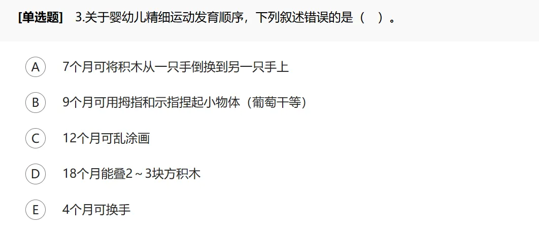 精细动作的发育:3~4个月时握持反射消失;6~7个月时出现换手与捏、敲等探索性动作;9~10个月时可用拇、示指拾物,喜撕纸;12~15个月时学会用匙,乱涂画;18个月时能叠2~3块方积木;2岁时可叠6~7块方积木,会翻书;4~5岁的儿童则能用剪子剪东西;6岁能系鞋带并打活结。
