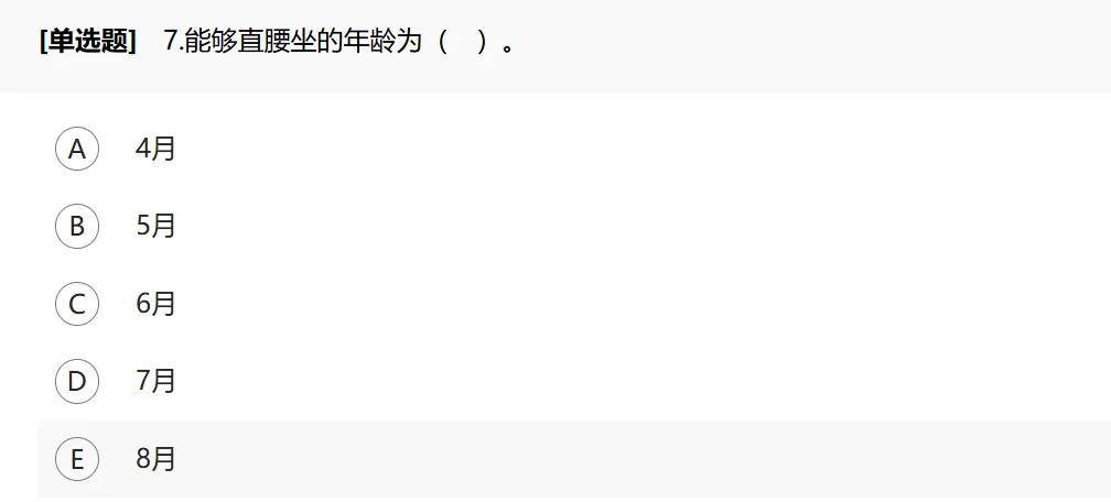 新生儿期全前倾,2~3个月半前倾,4~5个月扶腰坐,6个月拱背坐、能双手向前撑住独坐,7个月直腰坐,8~9个月扭身坐、自由玩。