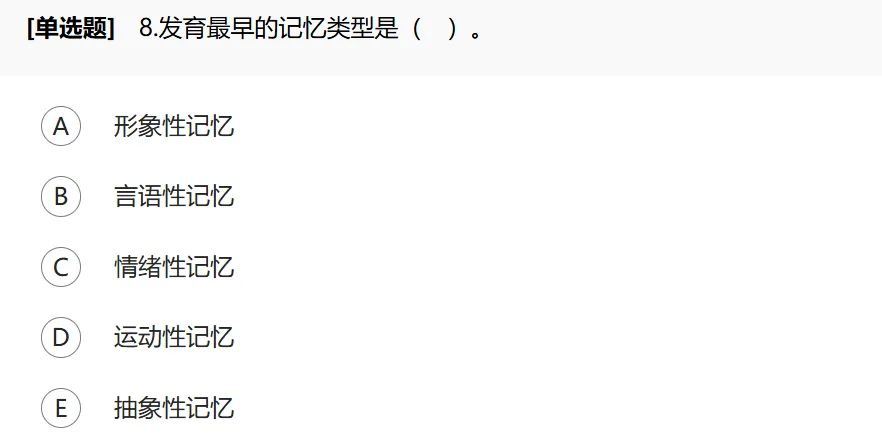 记忆主要有再认和回忆两种形式。按照记忆的内容,可以把记忆分为运动性记忆、情绪性记忆、形象性记忆和言语性记忆4种类型,在个体发生上它们都按一定的时间顺序出现。运动性记忆出现最早,约在生后第一个月,其次是情绪性记忆,开始于前6个月或更早些。形象性记忆出现稍早于言语性记忆,显著迟于运动性记忆和情绪性记忆。言语性记忆出现在生后第二年。