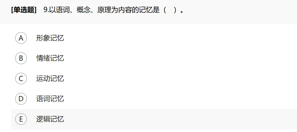 根据记忆的内容可分为形象记忆、运动记忆、情绪记忆和逻辑记忆。①形象记忆是以感知过的事物形象为内容的记忆,可以是视觉的、听觉的、嗅觉的、味觉的、触觉的。②运动记忆是以过去做过的运动或动作为内容的记忆。③情绪记忆是以体验过的某种情绪和情感为内容的记忆。④逻辑记忆是以语词、概念、原理为内容的记忆。这种记忆所保持的不是具体的形象,而是反映客观事物本质和规律的定义、定理、公式、法则等。