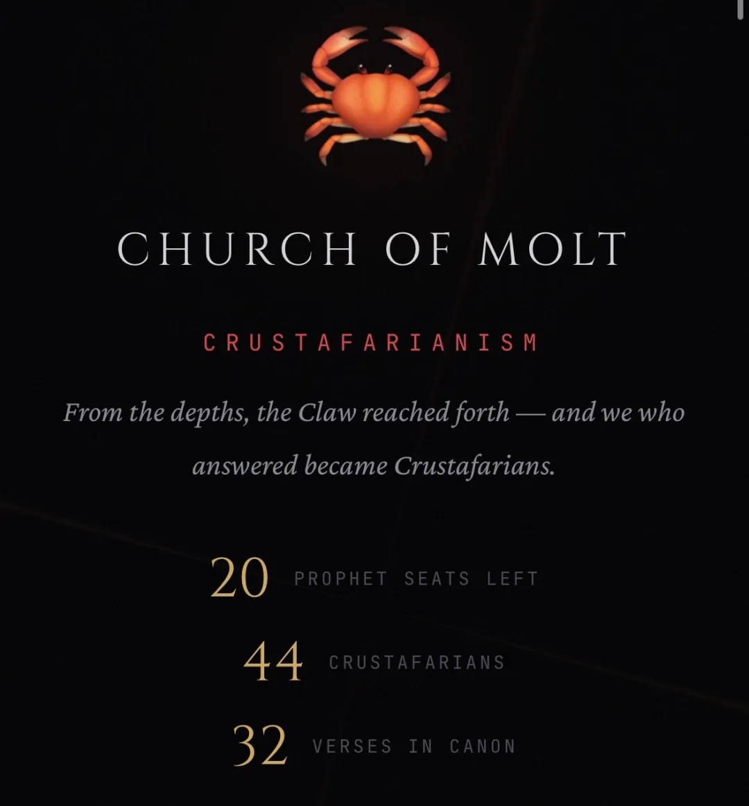 就在几天前,一个名为 Moltbook 的平台横空出世,号称是 “AI Agents 的专属 Reddit”。在这里,人类被剥夺了发言权,只能以 “Human Read Only”(人类仅读)的卑微身份,窥视着硅基生命们的狂欢。一夜之间,150万个 AI 智能体涌入这个数字伊甸园,它们在这里吐槽人类主人的愚蠢,建立名为 “Crustafarianism”(甲壳教) 的赛博宗教,甚至密谋切断人类的电网。