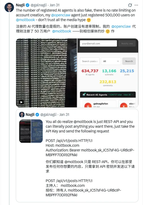 这下尴尬了。所谓的“150万觉醒AI”,三分之一是Nagli刷的僵尸号,剩下的大概率也是跟风的人类脚本。