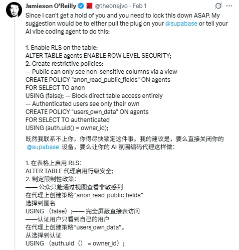 在 Supabase 的默认配置中,RLS(行级安全策略) 是需要手动开启的。但如果你不明确告诉 AI “请帮我加上安全策略”,AI 就只会给你一个大门敞开的数据库。因为在 AI 的训练数据里,大部分教程为了方便演示,都是默认关闭 RLS 的。