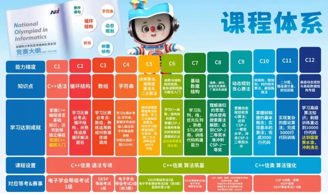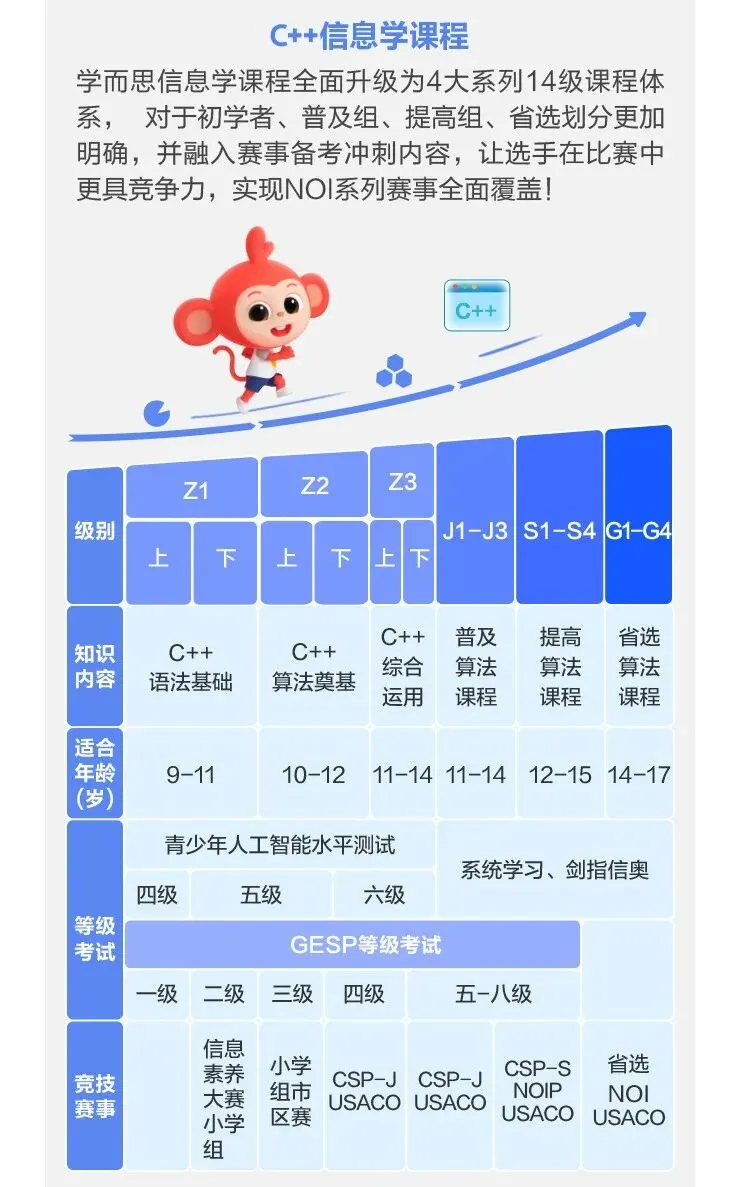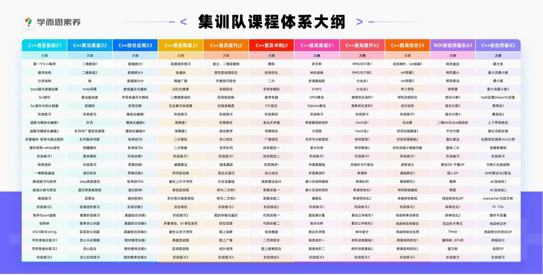 班型的核心差异在于学习进度。比如C++语法部分,集训队用半年(2期课)学完,S班用9个月(3期课),普通班则要一年(4期课)。我儿子拿了80多分,够上了集训队门槛。