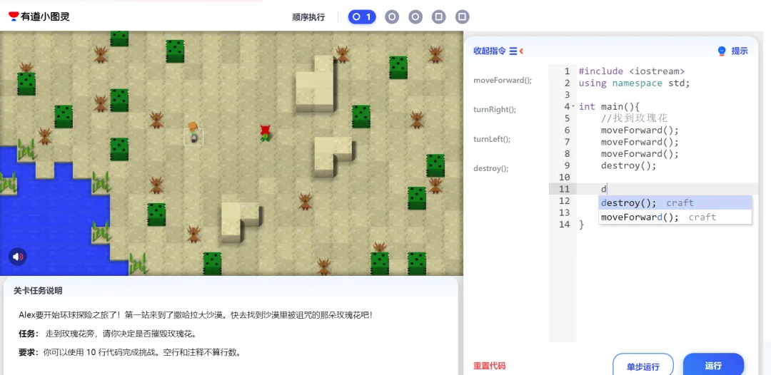 小图灵背靠网易,在激发兴趣上做得颇为聪明。它的入门课程,用的是网易独有版权的《我的世界》游戏皮肤作为编程场景。孩子通过编程让游戏角色完成关卡,代码是嵌入式选择——输入首字母会弹出备选命令,这大大降低了初学者的打字门槛和畏难情绪,让孩子感觉是在“玩”而不是在“学”。