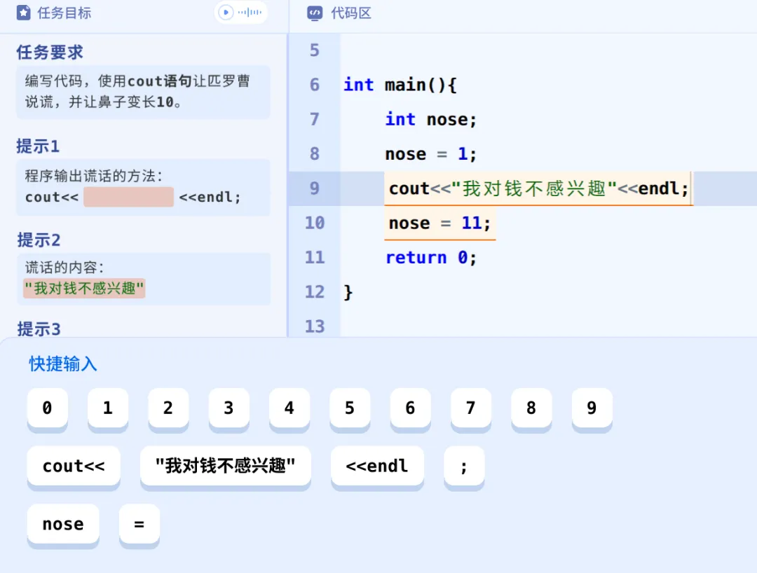 核桃编程的入门课,是几家里面游戏化和故事性做得最突出的之一。它主打线上课,课程采用“录播课+嵌入式操作界面”的模式,旁边有辅导老师实时答疑。孩子不需要一开始就写完整代码,而是在选项库里拖拽组合,但会被强制要求输入分号等关键符号,潜移默化地建立编程规范。