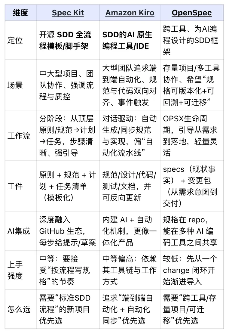 在传统开发里,文档经常滞后于代码:代码改了,文档来不及更新;久而久之,文档就变成“参考资料”。但在 SDD 范式中:规范才是第一“公民” — 它是团队协作的共同语言,也是唯一的事实来源。开发者用结构化、无歧义的自然语言或领域特定语言,把系统的意图、行为和约束讲清楚;随后由 AI Coding 作为“实现引擎”,严格依据规范生成代码、测试用例以及必要的辅助文档。以规范为中心组织开发:设计、代码、测试都围绕规范生成、验证与演进。注意,规范并不等于传统冗长的 Word 需求文档,后面我们会看到。此外,一个大型项目中可能会有很多规范(按功能/特性拆分)。随着 SDD 兴起,已经涌现出一批专门围绕该模式的 AI 工具生态。这里做简单了解与对比:- Github SpecKit:Github出品的一套标准化的命令行工具,适合中大型项目。得益于 Copilot 的深度集成,它能在每个规范环节提供智能模板与草案,帮助团队死磕流程标准化,做好质量控制。