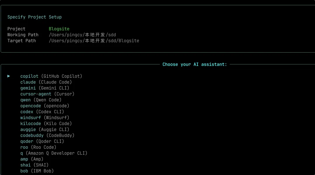 这样,传统 SDLC 从“阶段性交付”变成“持续演进”:生产环境的任何反馈,本质上都是对规范的补充。系统更容易保持架构一致与可维护。通过上述闭环,一个功能就能相对完整地交付。更关键的是,整个过程的产物(规范、计划、代码、测试用例等)都彼此对齐 — 这对后续维护、交接与新需求开发都极其友好。相比传统“边干边补文档”的混沌过程,SDD 的确提供了更强的可控性与可追溯性。实战 SDD:Spec-Kit + Github Copilot为了更直观地感受 SDD 如何落地,我们用 Gitub Spec Kit 搭配 Copilot,做一个最小可行的练习:开发一个简单的个人 Blog 网站并做一次迭代。也可以换成其他 Coding Agent:Spec Kit 几乎支持所有的 AI 编程工具