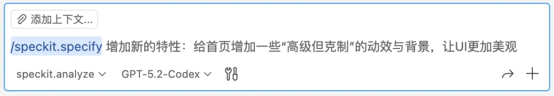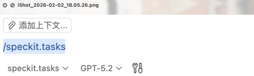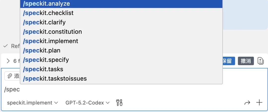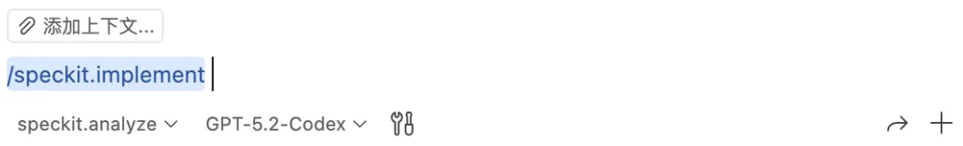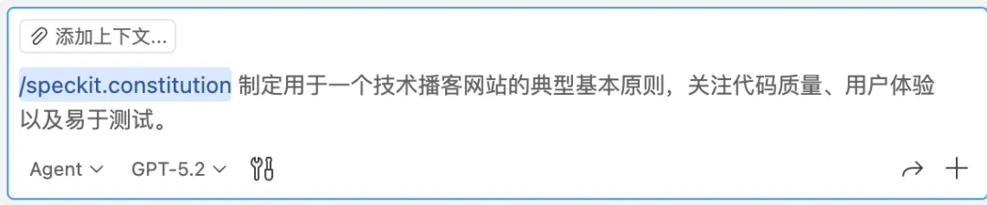 选择需要搭配的Code Agent,这里我们选择copilot。列出在 Copilot 里可用的 slash 命令(这些命令对应 SDD 的关键环节。其本质上是一种自定义智能体,提示模板放在.github目录下)。【3】打开VS Code,确认 Copilot 面板能看到命令。打开 Visual Studio Code,并打开 Copilot 面板。在输入框里键入 /speckit,应该会出现一系列 Speckit 命令列表。 如果没有出现,最常见原因是:VS Code 打开的目录不是刚初始化的项目根目录(导致 .github 里的提示模板没被加载)。【4】制定项目“宪法”(Constitution)选择一个常用的模型(我选择了GPT-5.2),然后输入如下命令:随后你会得到一个“项目宪法”文件(默认路径通常在):- .specify/memory/constitution.md