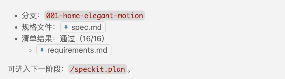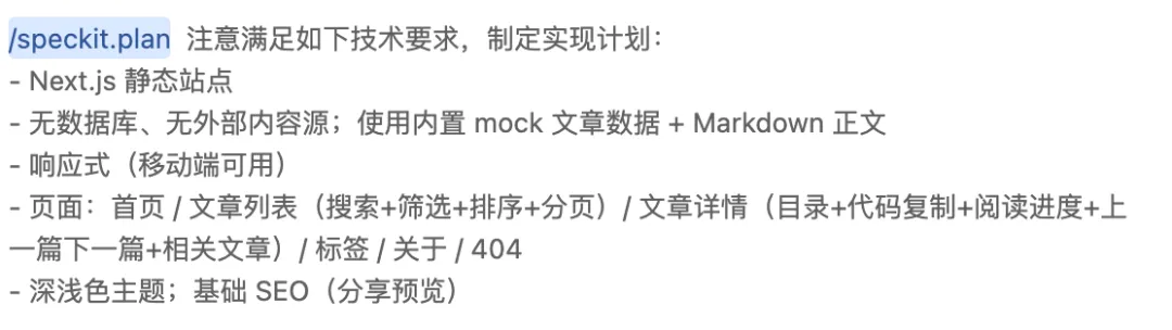 这个文件就是前面提到的“红线”,你完全可以按团队习惯删减和改写,以下是部分speckit生成的模板内容:借助/speckit.specify命令来把模糊的需求转化成结构化的模板规范:你会看到 Spec Kit 自动创建了一个分支目录(在 specs/ 下),并生成 spec.md。部分内容如下:现实项目里,这一步的输入不可能只有一句“做个 Blog”。更常见做法是:先让 AI 起草 spec.md,然后产品/研发/测试一起补齐、删改、对齐口径,形成可执行的共识版本。如果说 Spec 阶段输出的是 What & Why,Plan 阶段就开始回答 How。运行 /speckit.plan(并在提示里补充一些必要约束):Plan过程是一个比较复杂的过程,我们尽量简化的描述其处理步骤:- 读取:spec.md + constitution.md