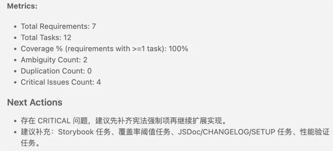 这一步产出的计划本身也可视为一种设计层面的“次级规范”:它让 AI 更容易按步骤生成成果,也让人类清楚每一步该检查什么、如何把控风险。这个阶段可能会发现规范中的歧义与漏洞,需要及时反馈调整。“根据任务清单(Tasks)执行 AI 编程,人类担任监工”AI 根据任务列表进行代码产出,并同步任务状态。在AI编程过程中可能涉及到依赖安装、组件实现、各个规范场景的任务实现、测试用例生成等。不同 SDD 工具的体验会有所差异:有的强调“一次生成一致的代码 + 测试 + 文档”,有的强调步骤化生成与逐步审查。早期的代码生成往往带探索性 — 它本身也在验证“规范是否可落地”,因此发现的偏差应及时反馈给规范。代码生成后,必须进行严格“体检”,确保符合规范与宪法:- 静态合规检查:检查是否违反“宪法”中的约束(质量/安全/风格等)