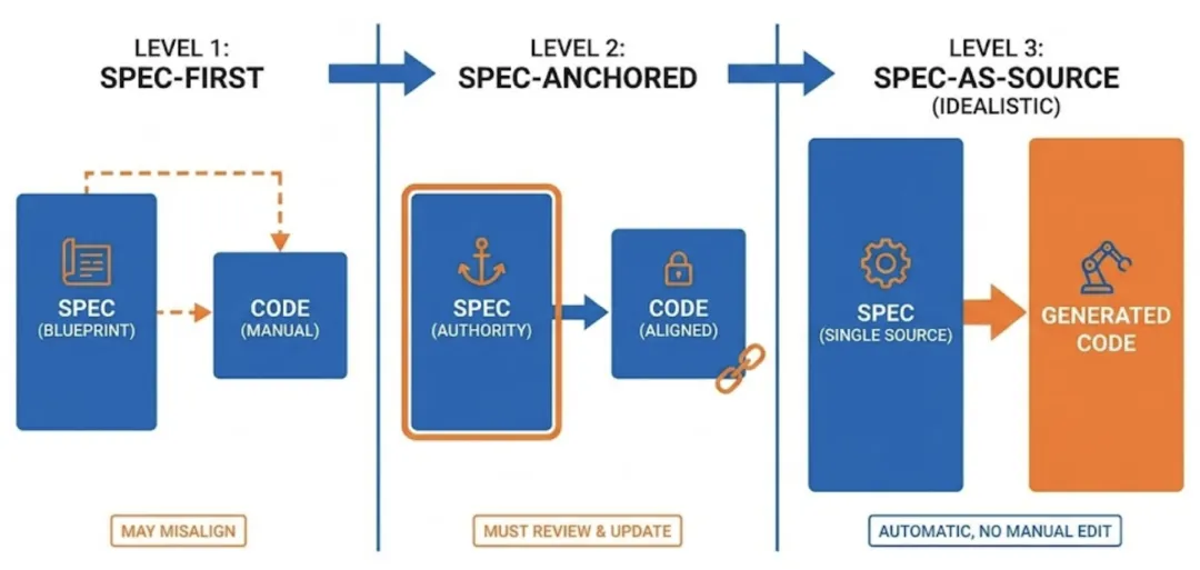 - Spec-as-source(规范即源码):人只改规范,代码强制由工具生成。