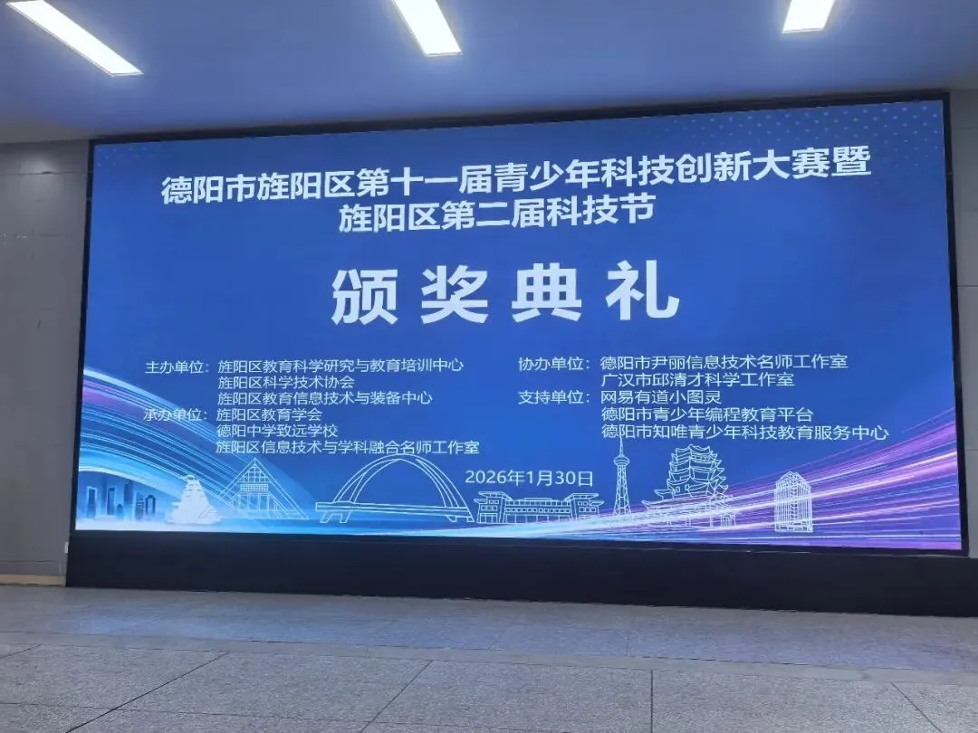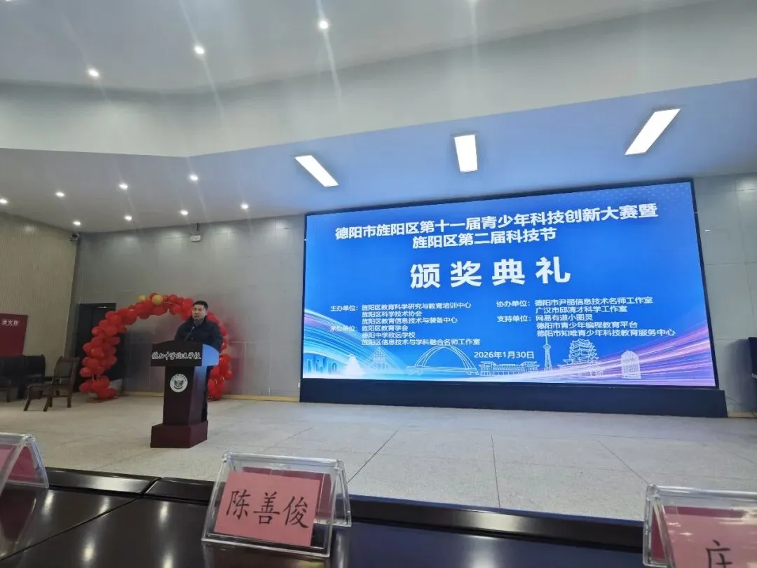 2026年1月30日,德阳市旌阳区第十一届青少年科技创新大赛暨旌阳区第二届科技节颁奖典礼在德阳中学致远学校举行。作为本次活动的支持方与合作方,德阳市尹丽信息技术名师工作室深度参与其中,以专业赋能、公益同行的姿态,为区域青少年信息素养提升注入强劲动力,与旌阳区江伟名师工作室携手书写协同育人新篇章。