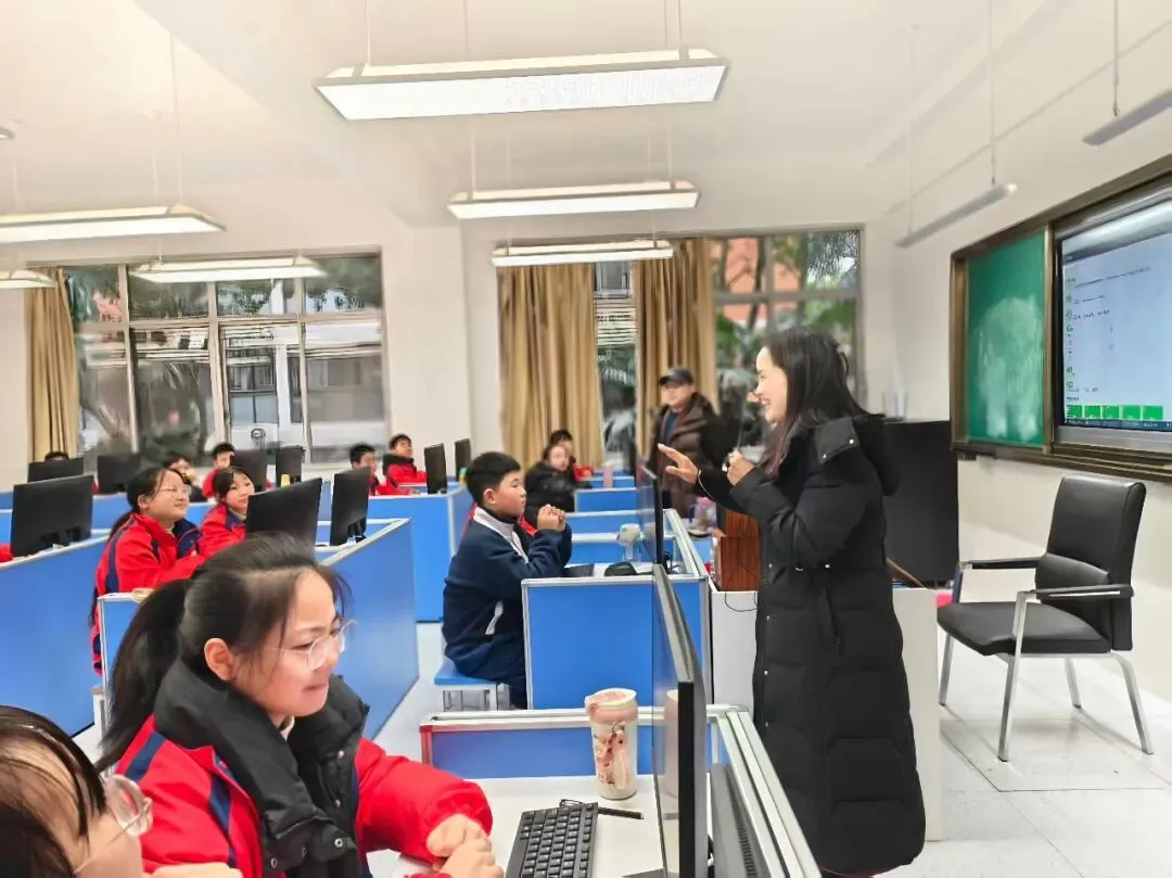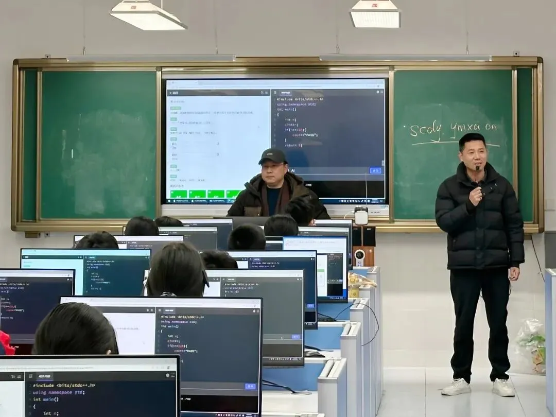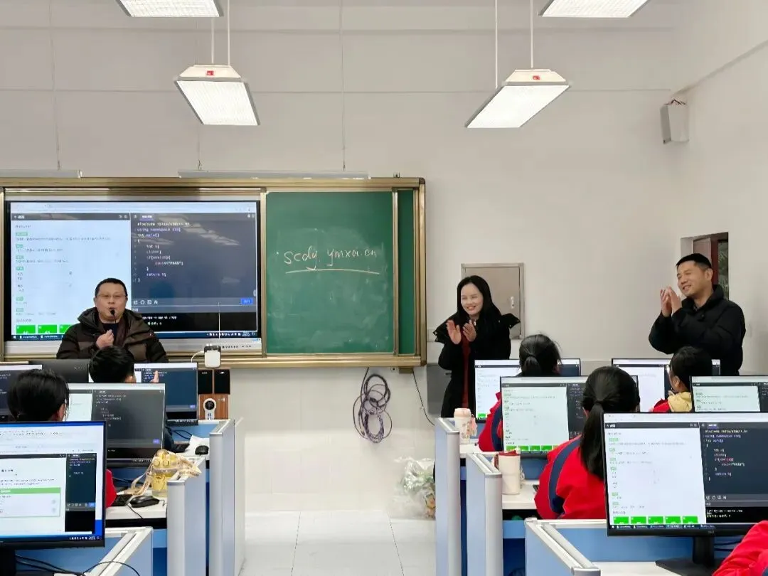 活动当天下午,工作室领衔人尹丽老师与成员苏建老师一同走进德阳外国语学校,实地考察并指导信息学公益课堂开展工作。据悉,工作室成员编程组组长袁永胜老师已在此持续开展了数日的信息学公益授课,课程作为工作室与该校公益战略合作的重要实践载体,依托工作室在信息技术教学与教研方面的专业积淀,围绕编程基础夯实、计算思维培育等核心内容,为同学们带来了系统且生动的学习体验。课堂上,袁老师凭借通俗易懂的讲解、丰富多样的互动形式,引导同学们沉浸式感受编程的魅力,鼓励大家大胆尝试、积极探索。现场,苏建老师率先与同学们亲切交流,殷切勉励大家:“这份公益课堂的学习机会来之不易,希望大家倍加珍惜,把课堂上的好奇转化为课后钻研的动力,在每一次代码实践中积累成长,不负时光,不负未来!”随后,尹丽老师也发表了暖心寄语,她表示:“信息学是开启未来科技之门的钥匙,工作室搭建这样的公益平台,就是希望让更多孩子平等接触优质教育资源。希望同学们永葆探索热情,在互帮互助中锤炼协作能力,在攻坚克难中提升实践本领,努力成长为兼具数字素养与创新精神的新时代青少年。”