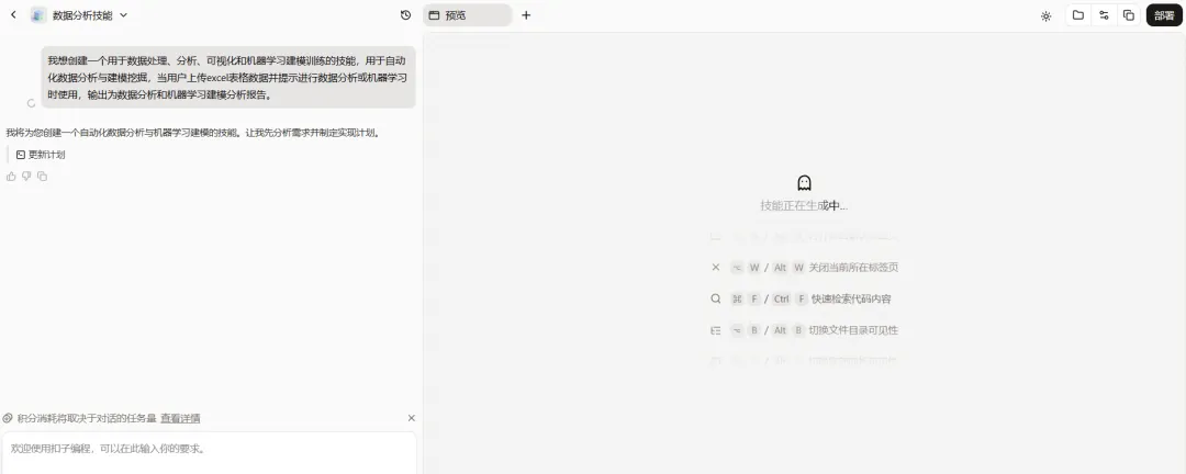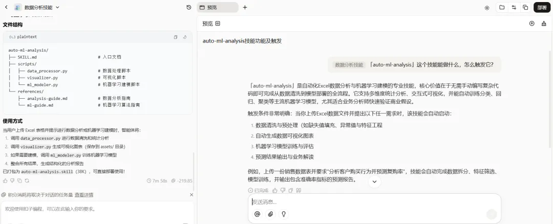 比如,我想创建一个自动化数据分析、可视化和机器学习模型训练的技能,按照模板提示词可以写为: