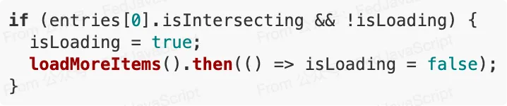 const observer = newIntersectionObserver(entries => {if (entries[0].isIntersecting && !isLoading) { isLoading = true;loadMoreItems().then(() => isLoading = false); }});observer.observe(document.querySelector('#sentinel'));