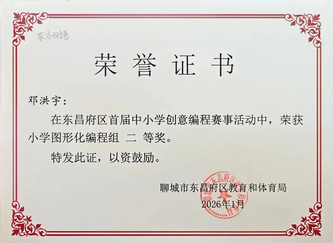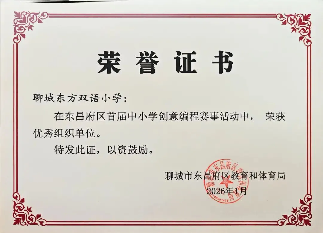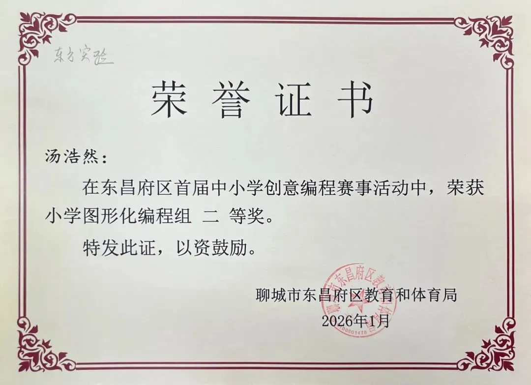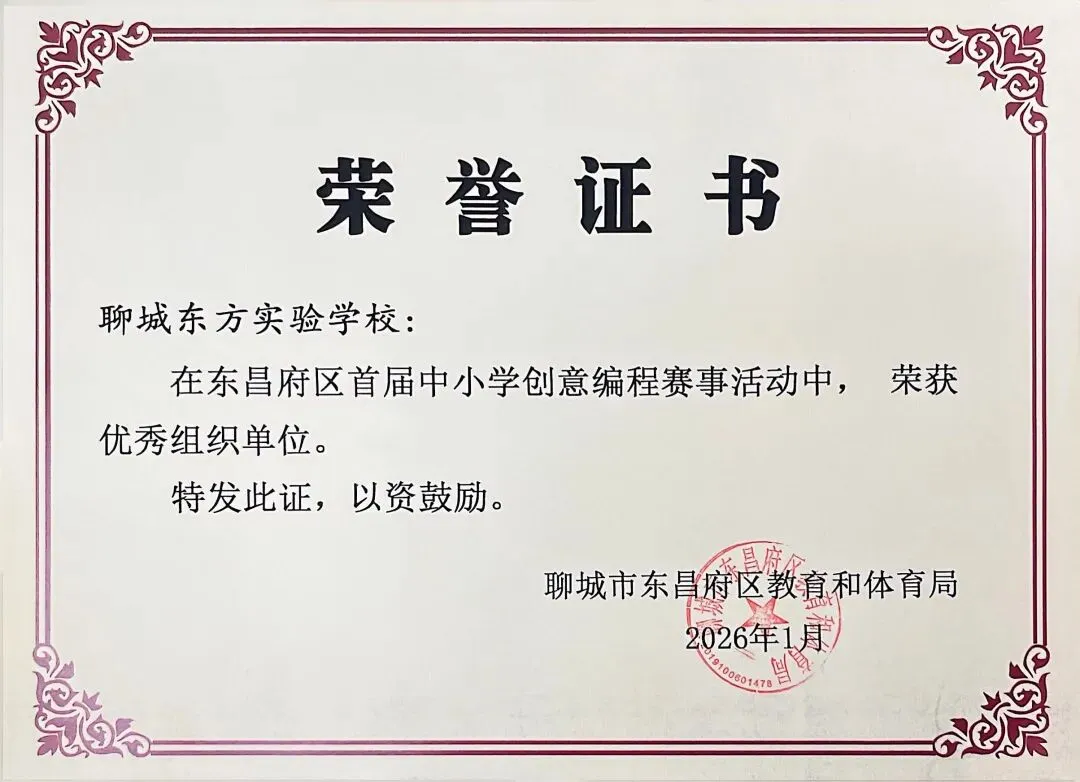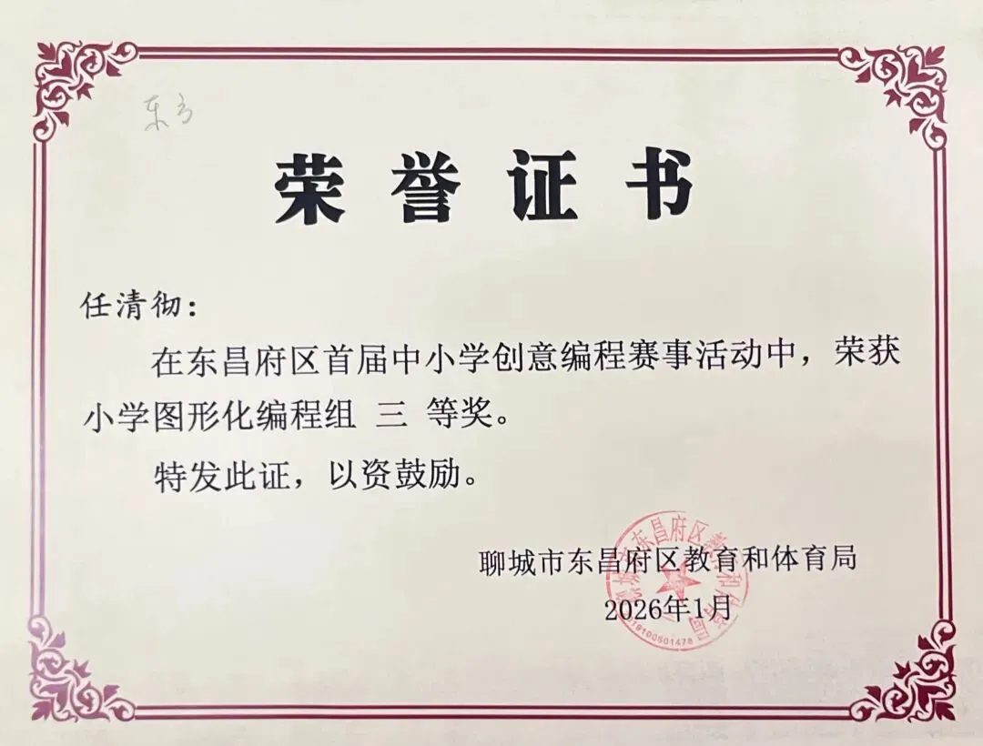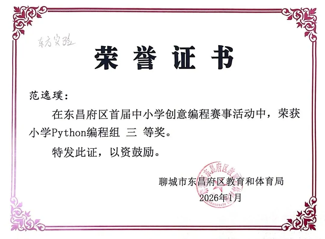 近日,聊城市东昌府区教育和体育局公布首届中小学创意编程赛事获奖名单。东方学子表现优异,在小学图形化编程、Python编程及初中C++等多个赛项中屡获佳绩,累计三十余人次荣获一、二、三等奖,展现出集团在科创教育领域的扎实积累与育人成效。