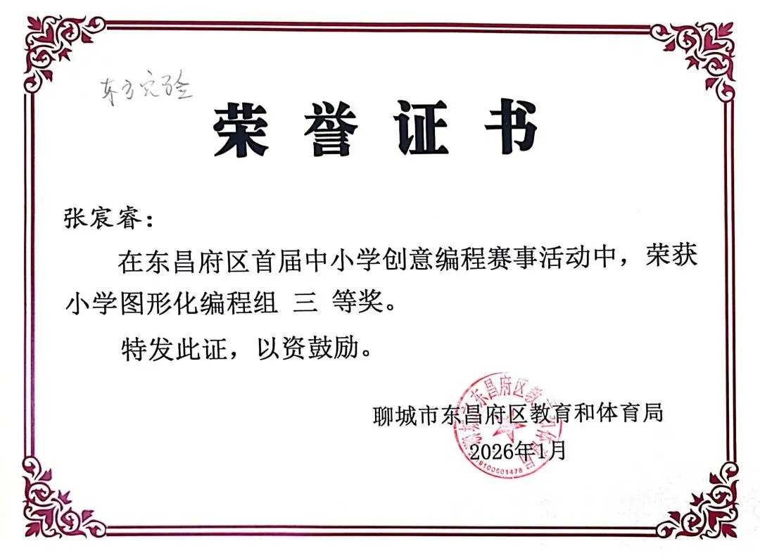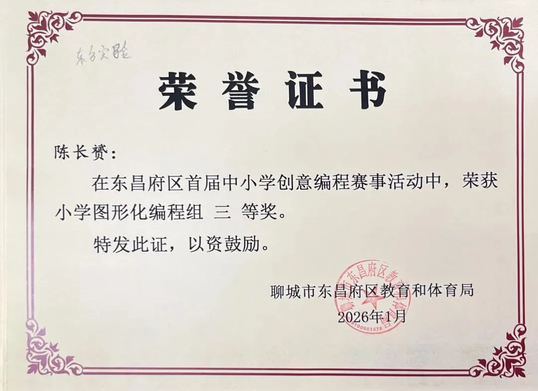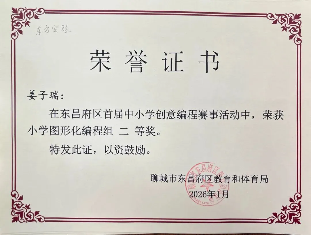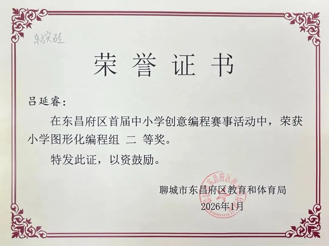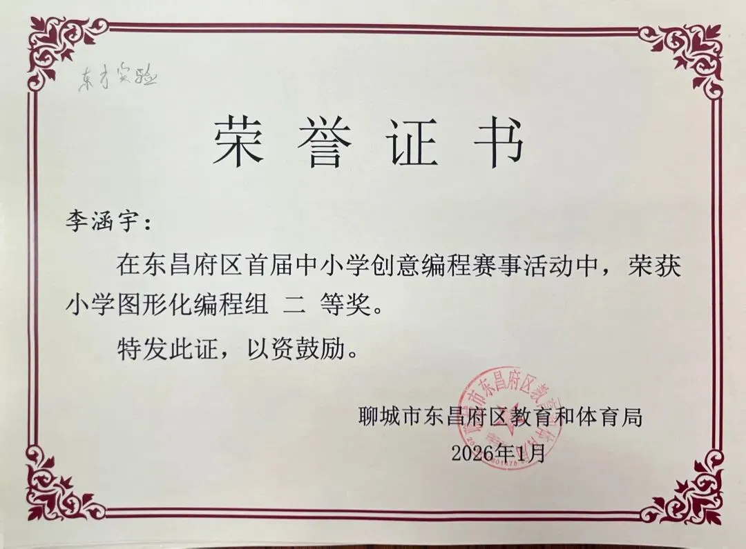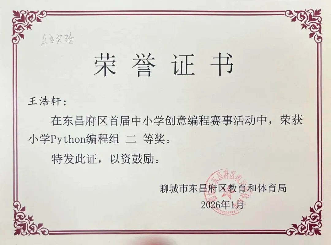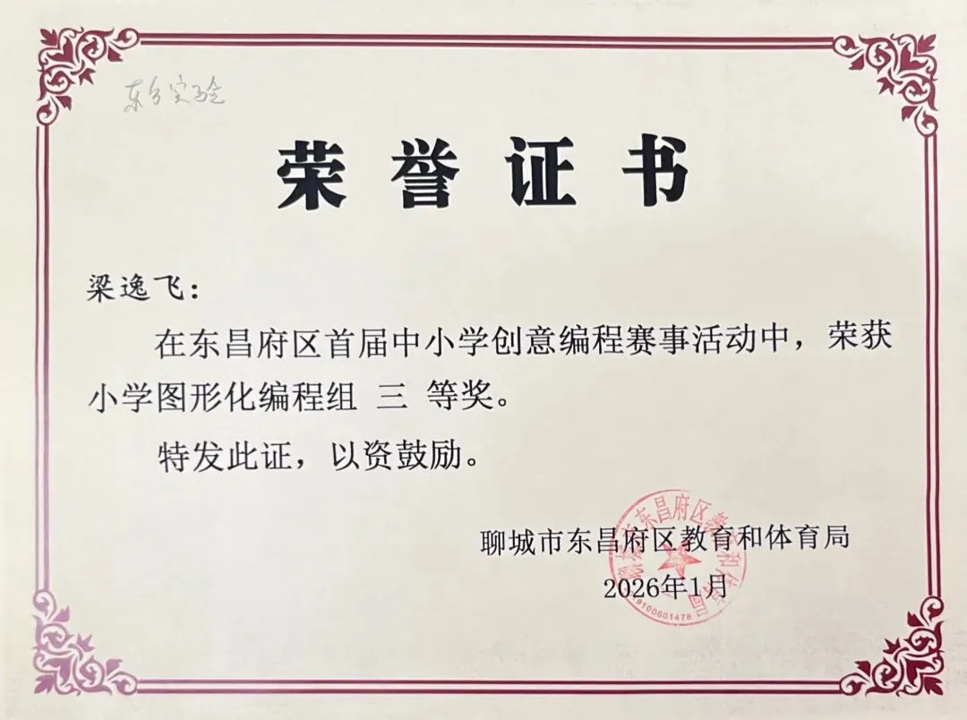 近日,聊城市东昌府区教育和体育局公布首届中小学创意编程赛事获奖名单。东方学子表现优异,在小学图形化编程、Python编程及初中C++等多个赛项中屡获佳绩,累计三十余人次荣获一、二、三等奖,展现出集团在科创教育领域的扎实积累与育人成效。