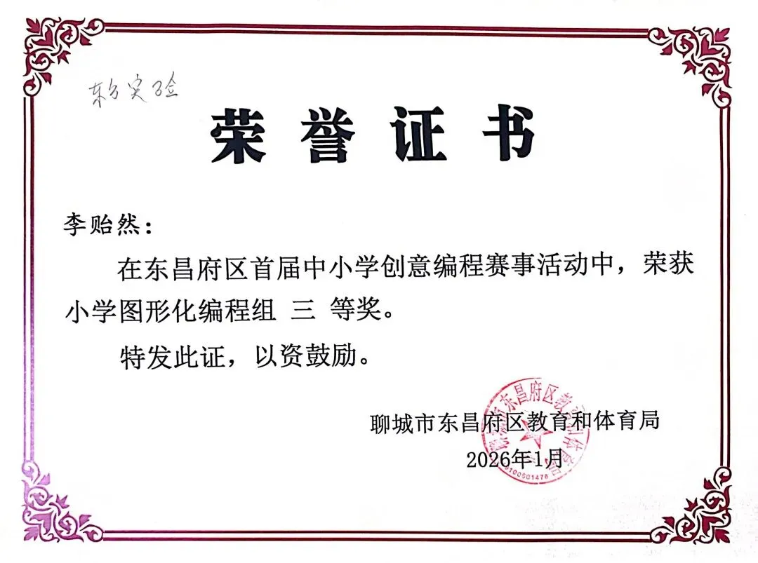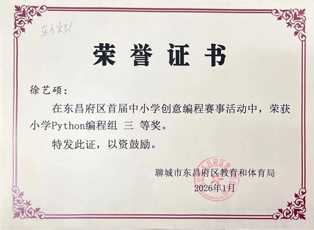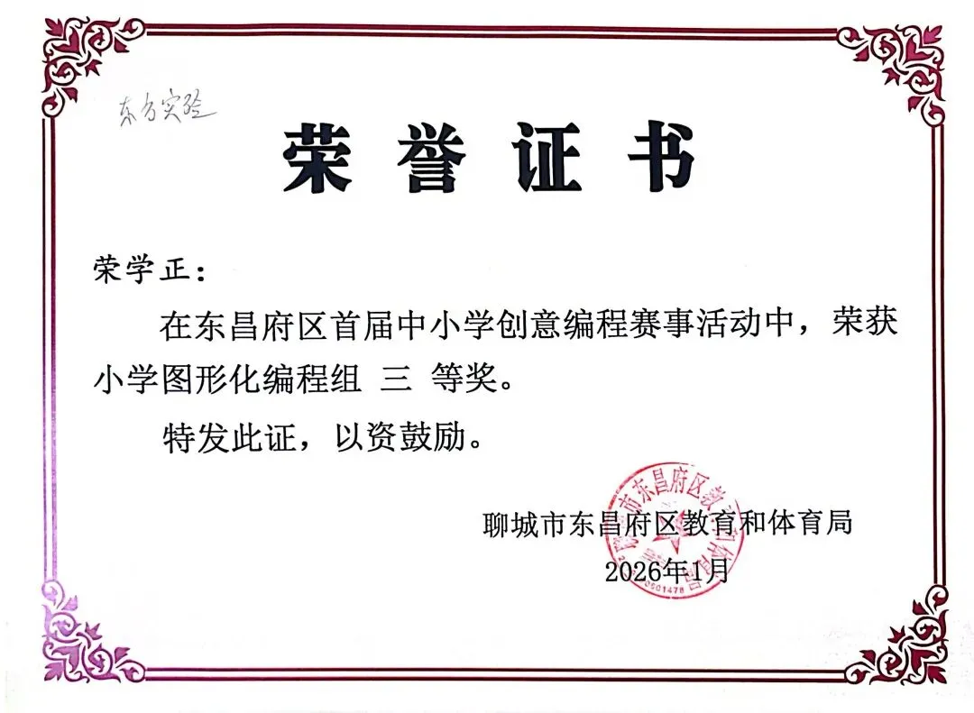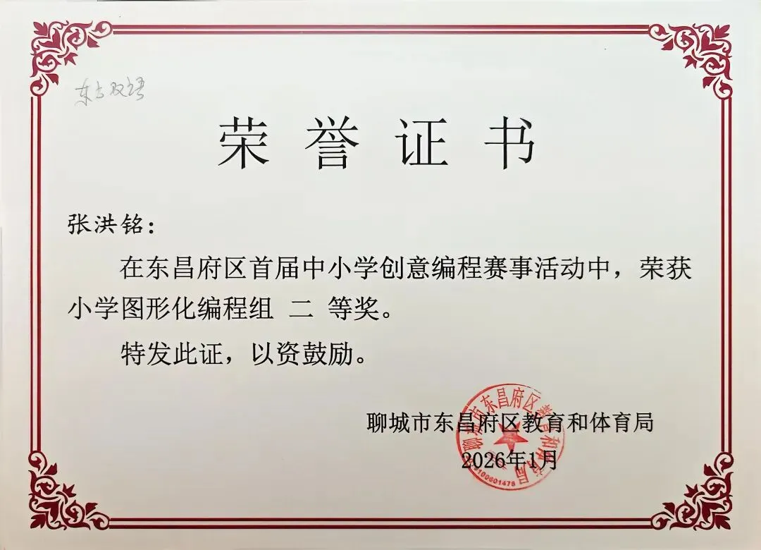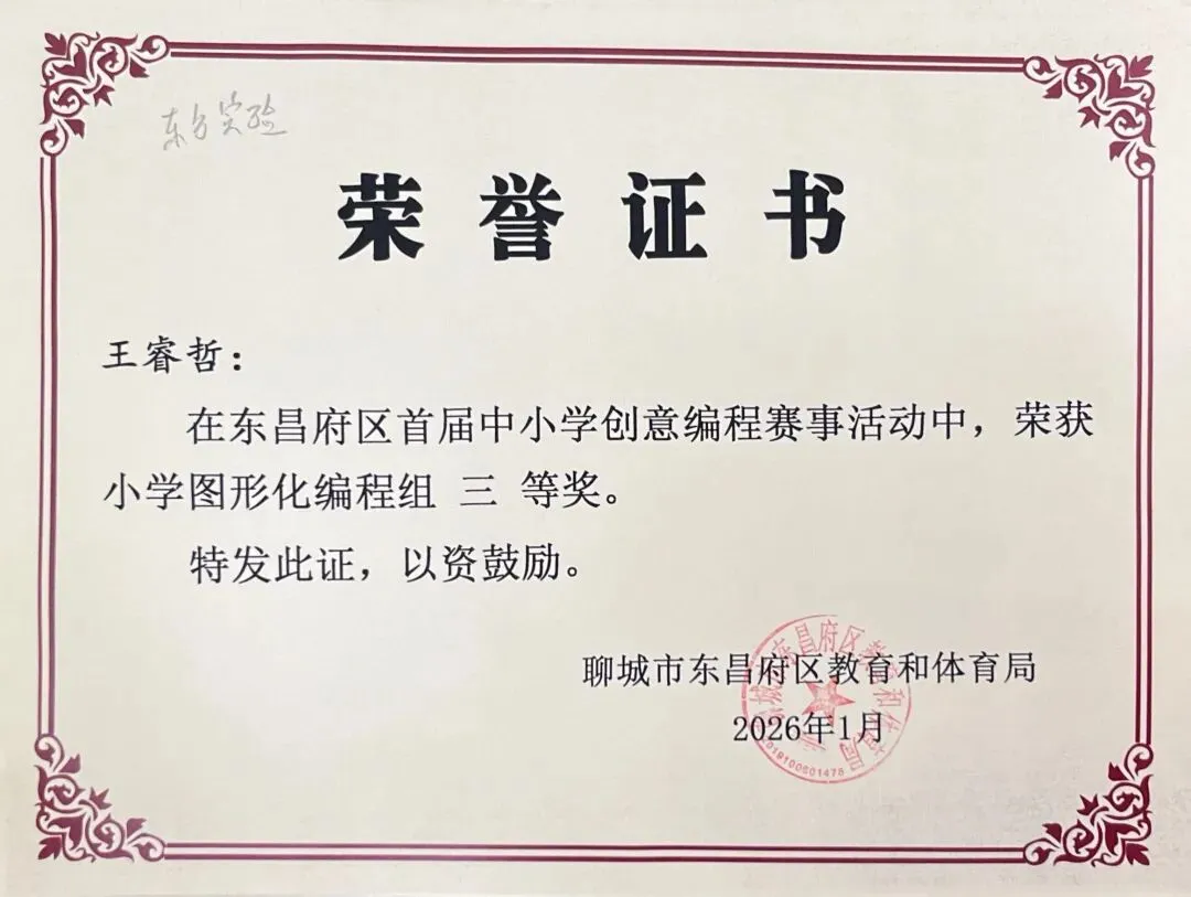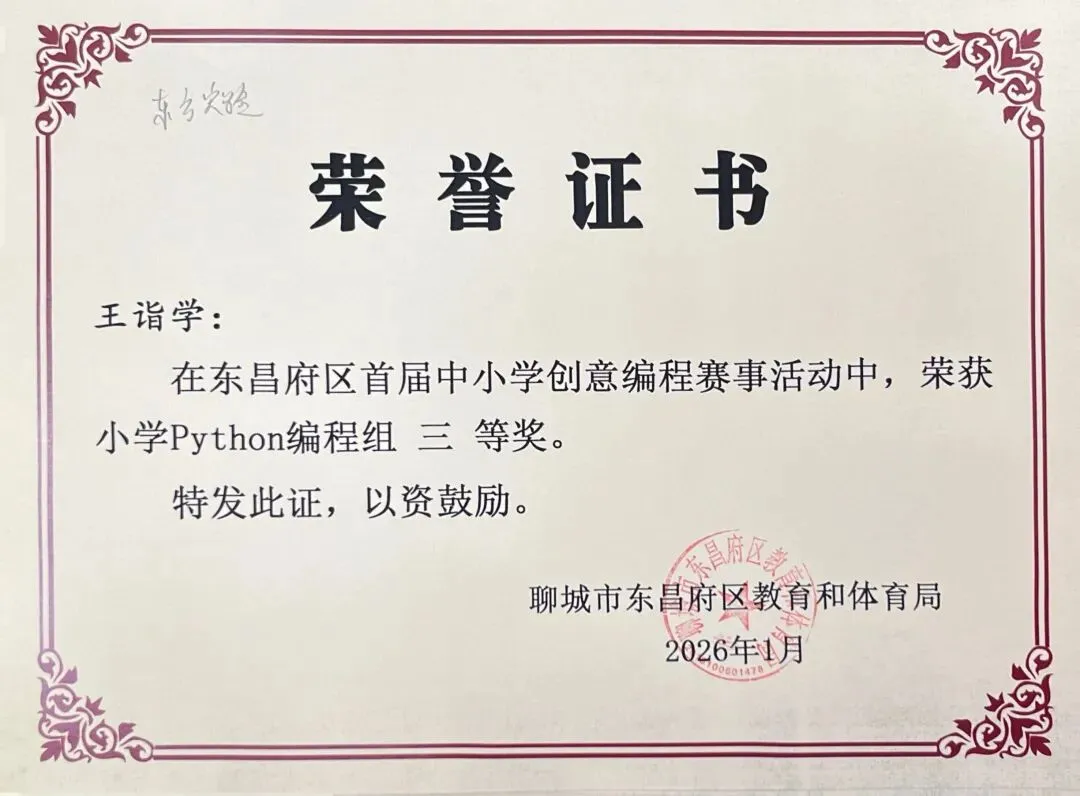 近日,聊城市东昌府区教育和体育局公布首届中小学创意编程赛事获奖名单。东方学子表现优异,在小学图形化编程、Python编程及初中C++等多个赛项中屡获佳绩,累计三十余人次荣获一、二、三等奖,展现出集团在科创教育领域的扎实积累与育人成效。
