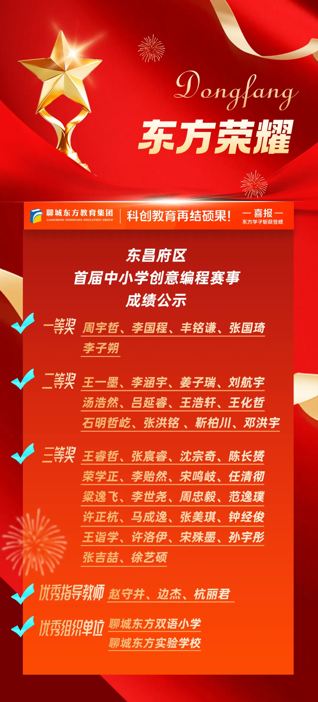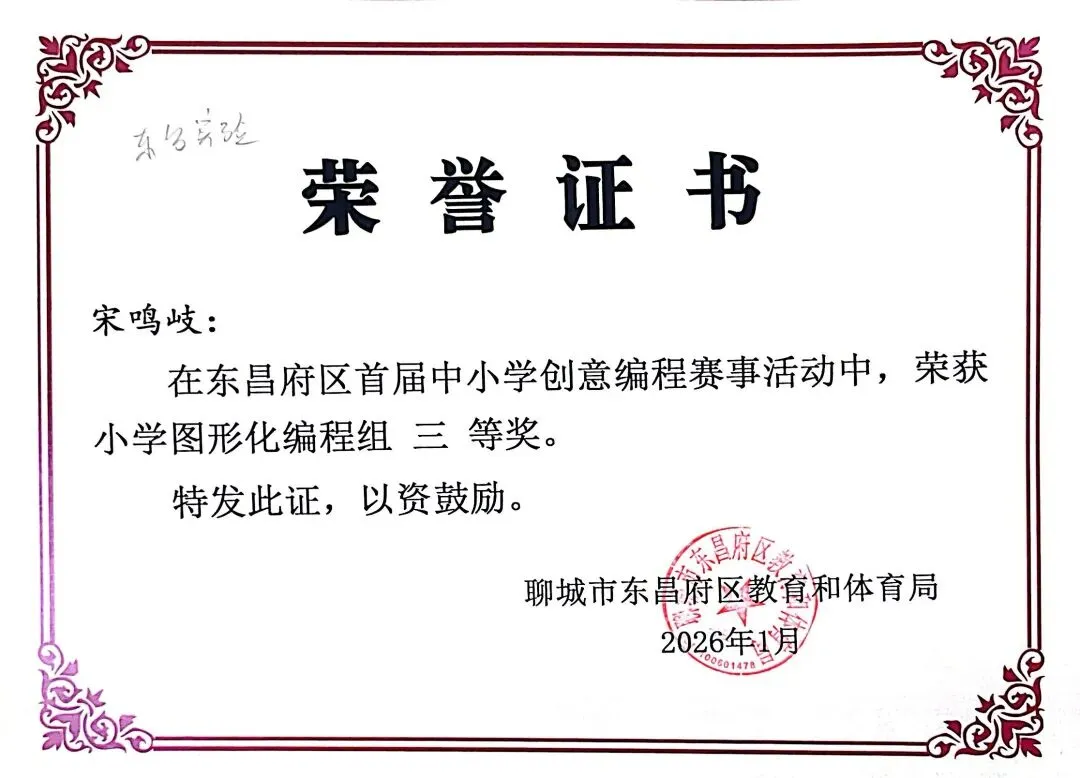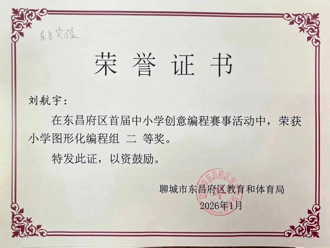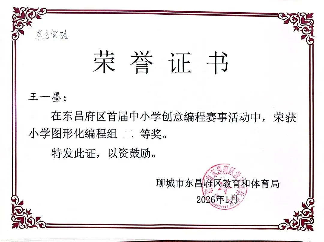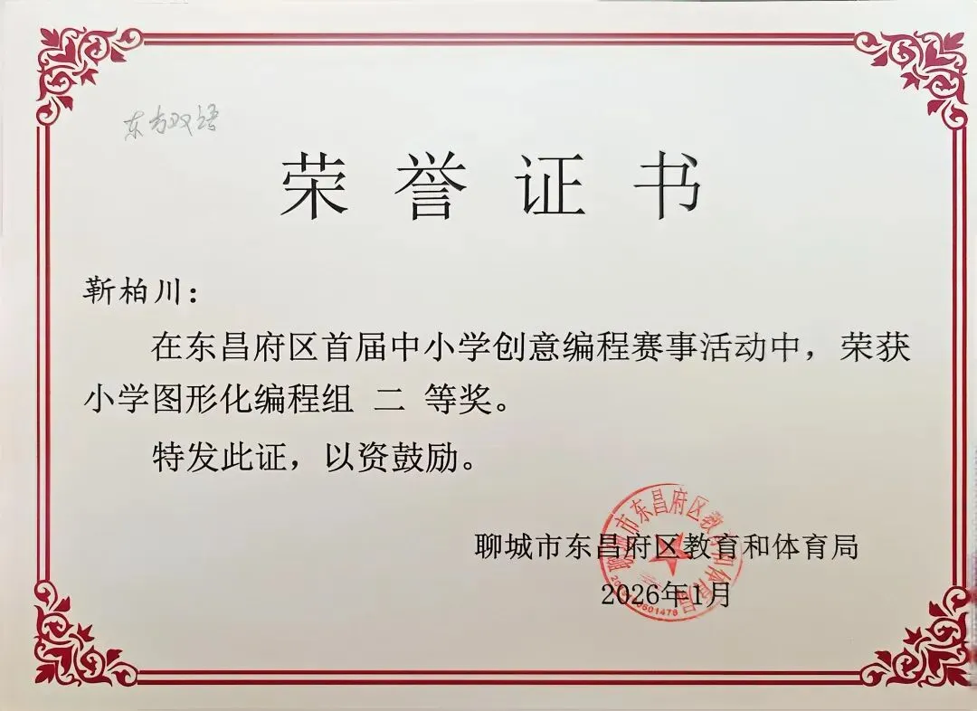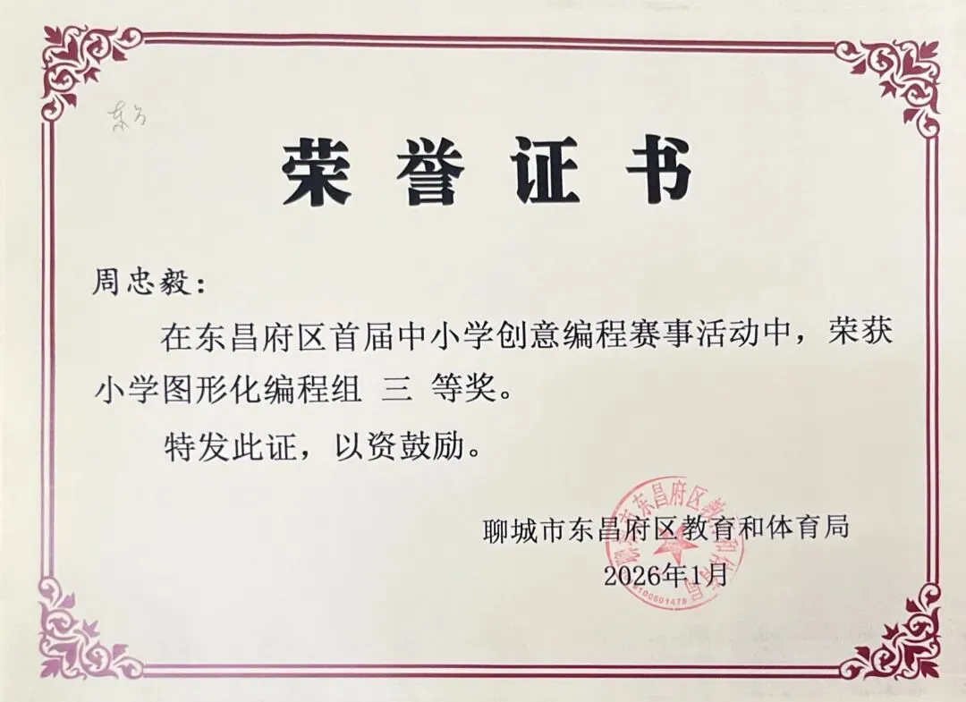 近日,聊城市东昌府区教育和体育局公布首届中小学创意编程赛事获奖名单。东方学子表现优异,在小学图形化编程、Python编程及初中C++等多个赛项中屡获佳绩,累计三十余人次荣获一、二、三等奖,展现出集团在科创教育领域的扎实积累与育人成效。