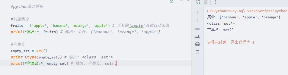 #创建集合fruits = {'apple', 'banana', 'orange', 'apple'} # 重复的'apple'会被自动去除print("集合:", fruits) # 输出: 集合: {'banana', 'orange', 'apple'}#空集合empty_set = set()print (type(empty_set)) # 输出: <class 'set'>print("空集合:", empty_set) # 输出: 空集合: set()