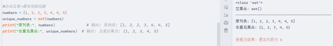 #自动去重-最实用的功能numbers = [1, 2, 2, 3, 4, 4, 5]unique_numbers = set(numbers)print("原列表:", numbers) # 输出: 原列表: [1, 2, 2, 3, 4, 4, 5]print("去重后集合:", unique_numbers) # 输出: 去重后集合: {1, 2, 3, 4, 5}