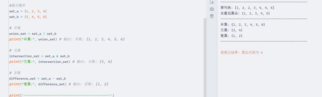#集合操作set_a = {1, 2, 3, 4}set_b = {3, 4, 5, 6}# 并集union_set = set_a | set_bprint("并集:", union_set) # 输出: 并集: {1, 2, 3, 4, 5, 6}# 交集intersection_set = set_a & set_bprint("交集:", intersection_set) # 输出: 交集: {3, 4}# 差集difference_set = set_a - set_bprint("差集:", difference_set) # 输出: 差集: {1, 2}