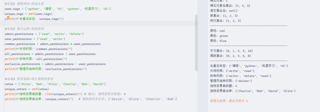 #实战3 投票系统-统计独特投票者votes = ['Alice', 'Bob', 'Alice', 'Charlie', 'Bob', 'David']unique_voters = set(votes)print(f"独特投票者数量: {len(unique_voters)}") # 输出: 独特投票者数量: 4print(f"独特投票者名单: {unique_voters}") # 独特投票者名单: {'David', 'Alice', 'Charlie', 'Bob'}