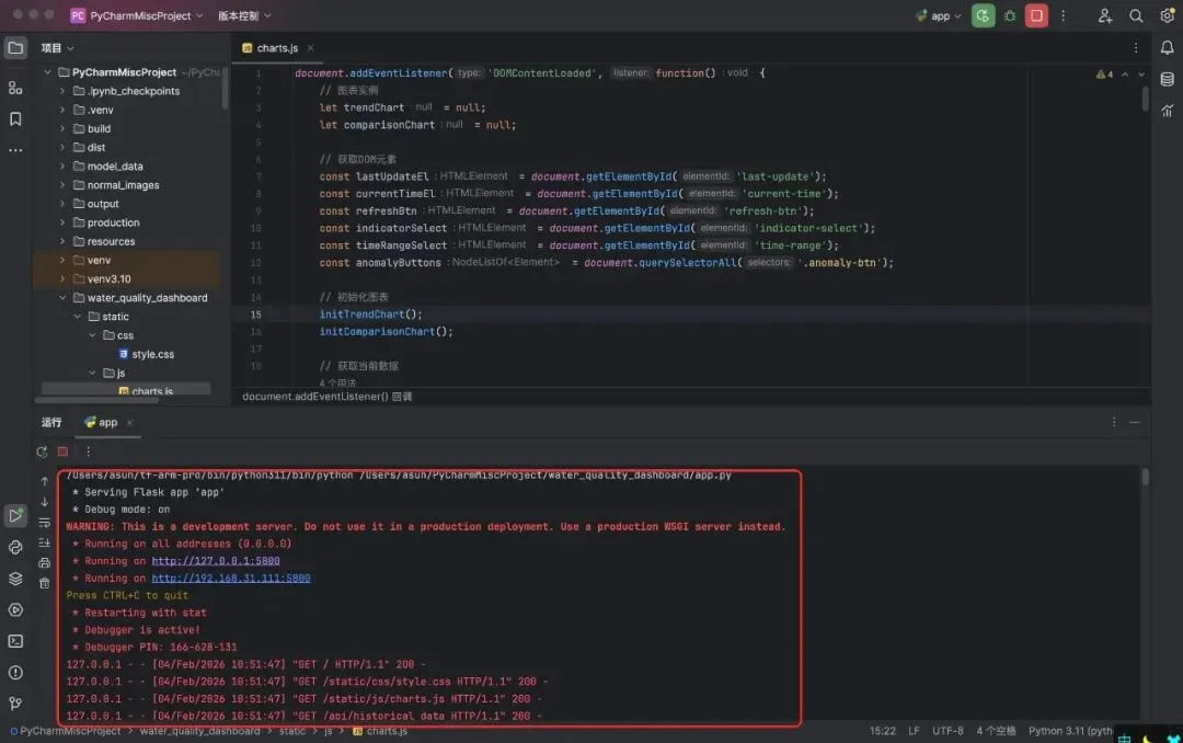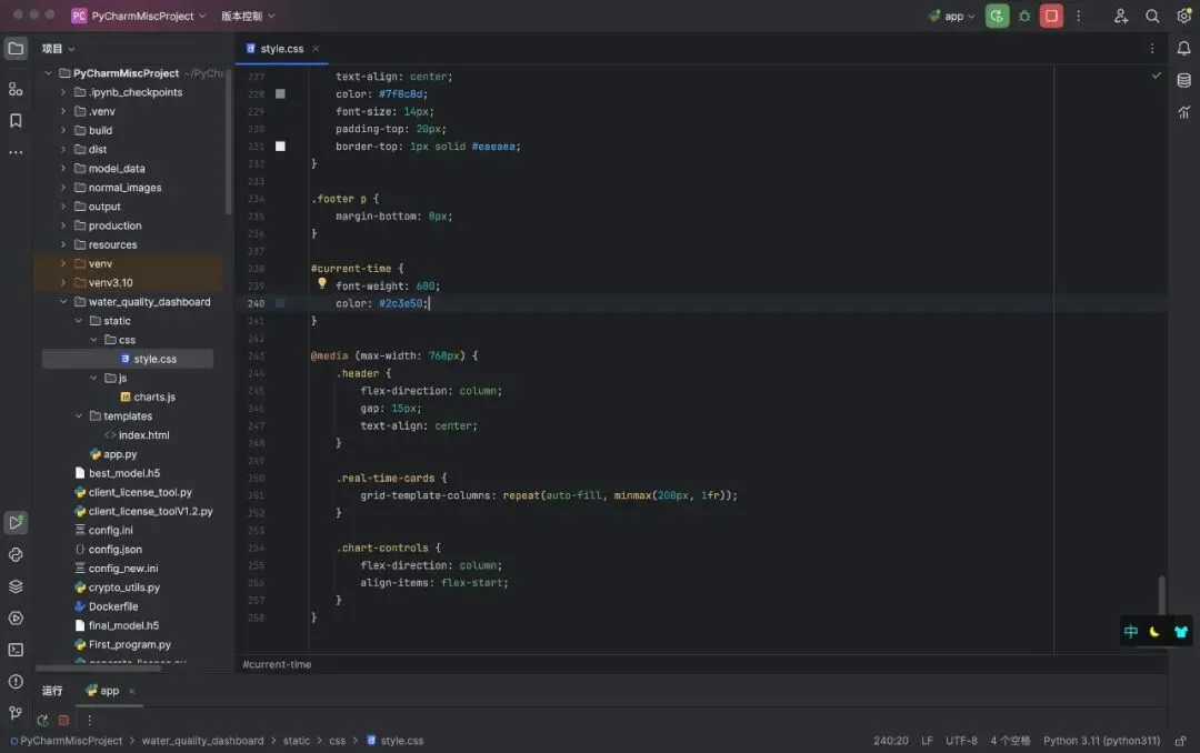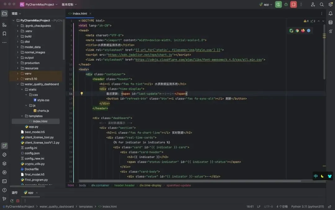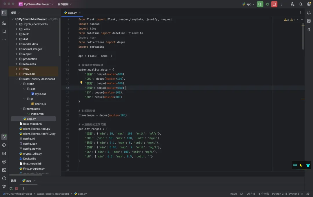 下面是一个完整的水质数据展示网页应用,使用Python Flask框架开发,包含实时数据和趋势图展示功能,大家需要在pycharm开发工具中按如下布局进行