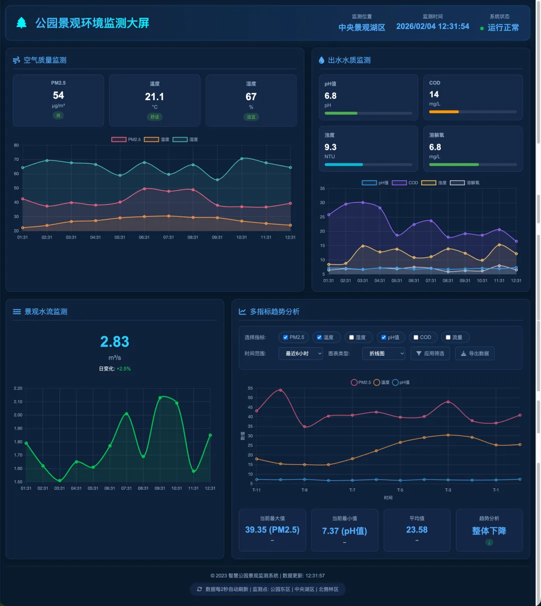 对上面html模板进行修改,修改为某公园景观关注的指标,比如空气、出水水质、流量指标,需要是可视化大屏的效果,请你修改html内容,其他代码不需要修改我们要求将原本的水质指标改为公园景观关注的指标,如空气、出水水质、流量指标等。同时,要求大屏效果,因此可能需要调整布局和样式,使其更适合大屏展示。由于其他代码(如app.py)不需要修改,我们仅修改HTML模板部分。但是注意,原app.py中定义了六个指标,现在我们需要修改为公园景观关注的指标。由于原代码中使用了六个指标,且模拟数据部分和API都依赖于这些指标,我们不能随意减少指标数量,但可以改变指标的名称和正常范围。然而,根据问题,只修改HTML内容,但实际指标名称在app.py中定义,如果只改HTML不改app.py,那么指标名称对不上。所以我们需要协调一下:要么修改app.py中的指标名称,要么在HTML中使用相同的指标名称。由于问题要求只修改HTML,但为了匹配新的指标,我们假设app.py中的指标已经更改为公园景观相关的指标。但这里我们只能修改HTML,所以我们需要知道新的指标名称是什么?根据问题,新的指标可能是:空气(可能包含多个指标,但这里我们只能选择几个代表性的)、出水水质、流量指标。我们假设新的六个指标为:PM2.5(空气)温度(空气)湿度(空气)出水COD(出水水质)出水氨氮(出水水质)流量(流量指标)但是原代码中每个指标都有对应的卡片和图表,所以我们这里需要将HTML中的指标名称和单位等进行更改。另外,大屏效果通常意味着更大的字体、更紧凑的布局、更醒目的颜色等。我们将对CSS进行一些调整,使其更符合大屏展示。由于问题要求只修改HTML,但为了达到大屏效果,我们也会修改CSS部分(因为CSS是静态文件,属于HTML模板的一部分,所以我们可以在HTML中内嵌CSS,也可以修改外部CSS文件。这里我们选择修改外部CSS,但为了保持完整性,我们也会在HTML中引入一个内联的样式以作调整。不过,原项目结构中有单独的CSS文件,我们可以修改它。但这里为了简单,我们直接在HTML中添加一些内联样式,同时保留对外部CSS的引用。由于我们不知道app.py中具体改了哪些指标,所以我们假设app.py中的指标已经改为:water_quality_data = {'PM2.5': deque(maxlen=100),'温度': deque(maxlen=100),'湿度': deque(maxlen=100),'出水COD': deque(maxlen=100),'出水氨氮': deque(maxlen=100),'流量': deque(maxlen=100)}并且,quality_ranges也需要相应调整,但这里我们只修改HTML,所以假设这些已经调整。因此,我们修改HTML模板,将指标名称替换为上述六个,并调整页面标题和各个部分的描述。同时,为了达到大屏效果,我们将调整布局,可能使用更宽的布局,并调整字体大小。由于时间关系,我们只修改HTML文件,并对CSS进行一些调整。如果原CSS文件不够,我们将在HTML中增加一些内联样式。注意:原CSS文件是独立的,我们可以在HTML中覆盖一些样式,以达到大屏效果。由于我们无法知道原CSS文件的所有内容,因此我们将以内联样式的方式添加一些大屏样式。