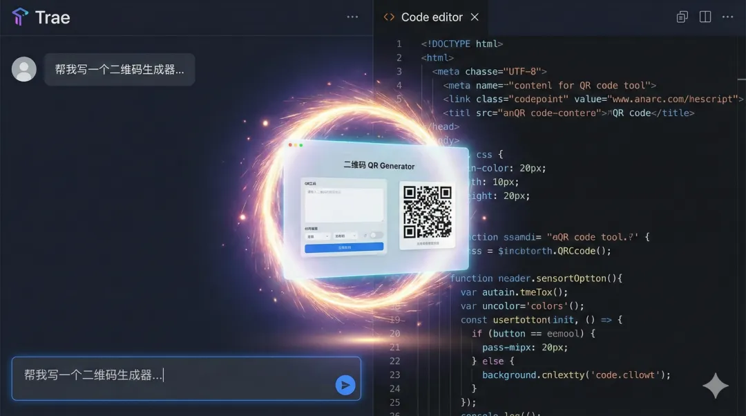传统的代码编辑器(像记事本),是你写一个字母,它显示一个字母。AI 编辑器(像 Trae),是你告诉它“我要一个盖浇饭”,它就自动去买菜、切菜、炒菜,最后端到你面前。