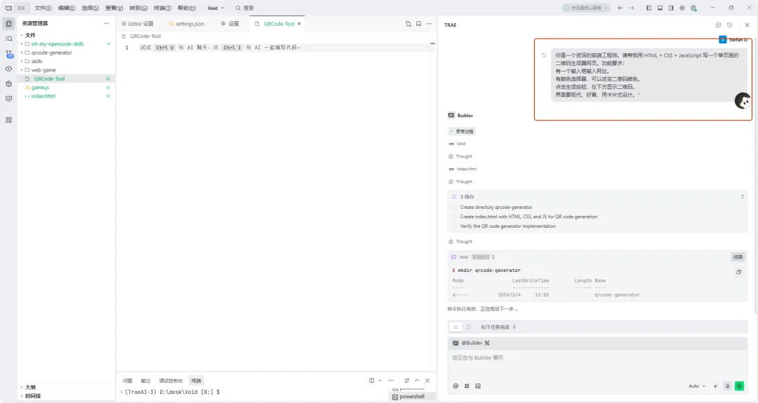 打开 Trae,点击“新建文件夹”,起名 QRCode-Tool。