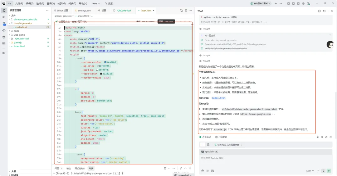 怎么看网页长啥样? 在 Trae 的终端(Terminal)里,或者直接在你的文件夹里找到 index.html,用浏览器打开它。