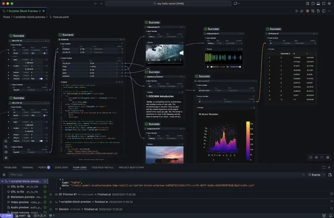 ① 零配置启动:安装 OOMOL Studio 后,自动拉取容器镜像,VSCode 同款编辑器,插件市场一键装。