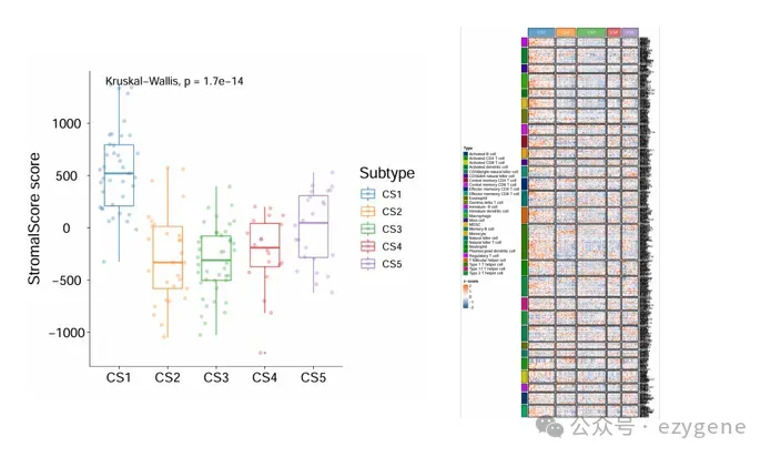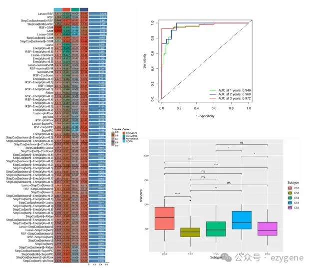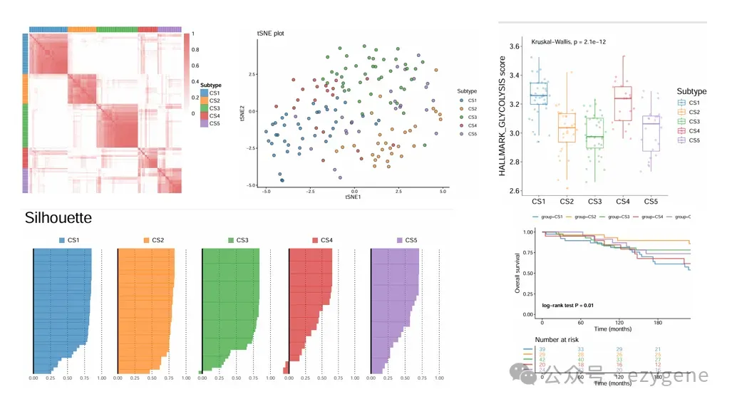 在患者分层方面,研究并未直接依赖传统的基因差异分析,而是基于289个糖酵解相关基因进行共识聚类,成功将患者稳定划分为五个预后差异明显的糖酵解亚型(GS1-GS5)。随后,通过101种机器学习算法组合筛选,最终利用RSF和plsRcox算法构建了风险评分模型,筛选出41个与生存密切相关的关键基因,并建立了风险评分系统。多队列验证结果显示,该模型在训练集、测试集及外部验证队列中均能稳定预测患者的生存结局,体现了模型的强大泛化能力。免疫微环境与风险模型的相关性