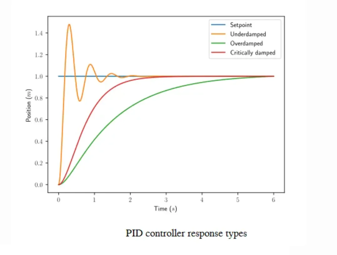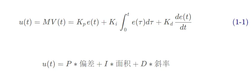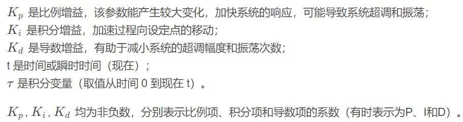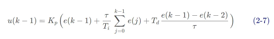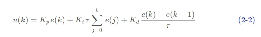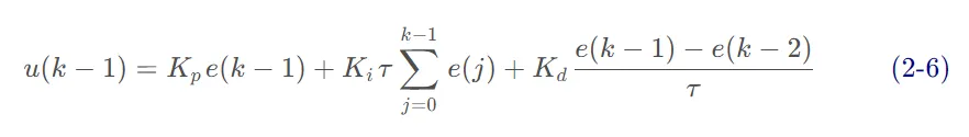 比例(Proportion)积分(Integral)微分(Differential)控制器(PID控制器或三项控制器)是一种采用反馈的控制回路机制,广泛应用于工业控制系统和需要连续调制控制的各种其他应用。PID控制器连续计算误差值 e(t) 作为所需设定点(SP) 和测量过程变量(PV)之间的差值,并应用基于比例、积分和导数项(分别表示为P、I和D)的校正,因此得名。r(t) 是期望的过程值或设定点(SP),y(t) 是测量的过程值(PV)。1911年,第一个PID控制器是由Elmer Sperry开发的。1922 年,俄裔美国工程师尼古拉斯·米诺斯基 ( Nicolas Minorsky)才首次利用理论分析制定了我们现在所说的 PID 或三项控制的正式控制律。米诺斯基当时正在为美国海军研究和设计自动船舶转向系统,他的分析基于对舵手的观察。他指出,舵手不仅根据当前航向误差,还根据过去的误差以及当前的变化率来驾驶船舶;然后 Minorsky 对此进行了数学处理。他的目标是稳定,而不是一般控制,这大大简化了问题。1933年,TIC(泰勒仪器公司)实现了完全可调节的前气动控制器。几年后,控制工程师通过将末端返回到一些假值,直到误差不为零,消除了比例控制器中发现的稳态误差。这个返回包含了误差,这被称为比例积分控制器。1940年,第一个气动PID控制器通过导数动作开发,以减少超调问题。1942年,Ziegler & Nichols引入了调谐规则,由工程师发现和设置PID控制器的合适参数。20世纪50年代中期,自动PID控制器在工业上得到了广泛的应用。工业中大多数现代 PID 控制都是作为DCS、PLC 或单片机程序来实现的。•工业自动化领域,大约95%的闭环操作使用PID控制器。像PID控制器这样的闭环系统包括一个反馈控制系统。该系统利用一个固定点对反馈变量进行评估,从而产生误差信号。在此基础上,它改变系统输出。这个过程将继续,直到误差达到零,否则反馈变量的值就等于一个固定点。与ON/OFF型控制器相比,该控制器提供了良好的效果。在开/关型控制器中,只需两个条件即可管理系统。大多数暖通空调系统、冰箱都采用这种方法。例如,在冰箱中,它会冷却内部直到达到所需温度,然后关闭冷却器,直到达到高于所需温度的设定值。一旦工艺值低于固定点,则开启。类似地,一旦该值高于固定值,它将关闭。这种控制器的输出不稳定,在不动点的区域内振荡频繁。然而,与ON/OFF型控制器相比,PID 控制器更加稳定和准确。https://docs.wpilib.org/en/stable/docs/software/advanced-controls/introduction/introduction-to-pid.html由PID控制器驱动的系统通常具有三种类型的响应:欠阻尼、过阻尼和临界阻尼。•临界阻尼响应具有最快的上升时间,且不会超过参考值。r(t) setpoint, reference,是期望的过程值或设定值(SP);y(t) output, process variable,是测量的过程值,输出值(PV);u(t) control effort,是控制量;PID控制器的显着特点是能够利用比例、积分和微分这三个控制项对控制器输出的影响来进行精确和最优的控制。PID 控制器,不断计算误差值e(t) 作为所需设定点之间的差异SP=r(t) 和测量的过程变量PV=y(t):e(t)=r(t)−y(t) ,并应用基于比例、积分和导数项的修正。控制器尝试通过调整控制变量来最小化随时间变化的误差u(t)。manipulated variable (MV)。http://matlab.fei.tuke.sk/orhs/subory/podklady/pid_controller_slidy.pdf由于计算机控制是一种采样控制,它只能根据采样时刻的偏差计算控制量,而不能像模拟控制那样连续输出控制量,进行连续控制。由于这一特点,(式 1-1)中的积分项和微分项不能直接使用,必须进行离散化处理。离散化处理的方法为:以τ作为采样周期,k作为采样序号,则离散采样时间kτ对应着连续时间t,用矩形法数值积分近似代替积分,用一阶后向差分近似代替微分,可作如下近似变换:将(式 2-1)代入(式 1-1),就可以得到离散的 PID 表达式为将(式 2-1)代入(式 1-2),就可以得到离散的PID 表达式为注意:必须使τ为定值,或者变化小到可以忽略,这样P、I、D才是固定常数,才可能调节增量式 PID 控制算法可以通过(式 2-2)推导出。由(式 2-2)可以得到控制器的第 k-1 个采样时刻的输出值为:由(式 2-3)可以得到控制器的第 k-1 个采样时刻的输出值为:用(式 2-3)减去(式 2-7)相减并整理,就可以得到增量式 PID 控制算法公式:由(式 2-8)可以看出,如果计算机控制系统采用恒定的采样周期τ,一旦确定 A、 B、 C,只要使用前后三次测量的偏差值,就可以由(式 2-8)求出控制量。增量式 PID 控制算法与位置式 PID 算法(式 2-3)相比,只需要保持当前时刻以前三个时刻的偏差值即可,累计误差较小,计算量小的多,因此在实际中得到广泛的应用。而位置式 PID 控制算法也可以通过增量式控制算法推出递推计算公式:(式 2-9)就是目前在计算机控制中广泛应用的数字递推 PID 控制算法。