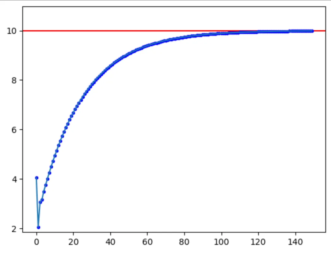 import numpy as npimport matplotlib.pyplot as pltclass PositionPID(object): """位置式PID算法实现""" def __init__(self, target, cur_val, dt, max, min, p, i, d) -> None: self.dt = dt # 循环时间间隔 self._max = max # 最大输出限制,规避过冲 self._min = min # 最小输出限制 self.k_p = p # 比例系数 self.k_i = i # 积分系数 self.k_d = d # 微分系数 self.target = target # 目标值 self.cur_val = cur_val # 算法当前PID位置值,第一次为设定的初始位置 self._pre_error = 0 # t-1 时刻误差值 self._integral = 0 # 误差积分值 def calculate(self): """ 计算t时刻PID输出值cur_val """ error = self.target - self.cur_val # 计算当前误差 # 比例项 p_out = self.k_p * error # 积分项 self._integral += (error * self.dt) i_out = self.k_i * self._integral # 微分项 derivative = (error - self._pre_error) / self.dt d_out = self.k_d * derivative # t 时刻pid输出 output = p_out + i_out + d_out # 限制输出值 if output > self._max: output = self._max elif output < self._min: output = self._min self._pre_error = error self.cur_val = output return self.cur_val def fit_and_plot(self, count = 200): """ 使用PID拟合setPoint """ counts = np.arange(count) outputs = [] for i in counts: outputs.append(self.calculate()) print('Count %3d: output: %f' % (i, outputs[-1])) print('Done') # print(outputs) plt.figure() plt.axhline(self.target, c='red') plt.plot(counts, np.array(outputs), 'b.') plt.ylim(min(outputs) - 0.1 * min(outputs), max(outputs) + 0.1 * max(outputs)) plt.plot(outputs) plt.show()pid = PositionPID(10, -5, 0.5, 100, -100, 0.2, 0.1, 0.01)pid.fit_and_plot(150)